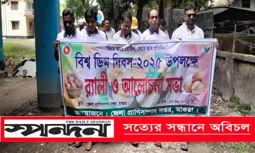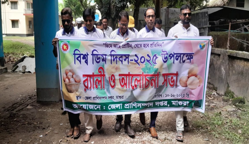 মাগুরা প্রতিনিধি : ‘ডিমে আছে প্রোটিন, খেতে হবে প্রতিদিন’ এ প্রতিপাদ্য নিয়ে মাগুরায় র্যালি ও আলোচনা সভার মধ্য দিয়ে বিশ্ব ডিম দিবস পালিত হয়েছে। এ উপলক্ষে শুক্রবার জেলা প্রাণিসম্পদ দপ্তরের আয়োজনে একটি র্যালি বের হয়। শেষে জেলা প্রাণিসম্পদ কার্যালয়ে আলোচনা সভায় জেলা প্রাণিসম্পদ অফিসার ডাক্তার মিহির কান্তি বিশ্বাস সভাপতিত্বে বক্তব্য রাখেন ডাক্তার শরিফুল ইসলাম, ডাক্তার সুশান্ত রায়, পুষ্পেন কুমার সিকদার ও খামারি সুমন পাটোয়ারী। আলোচনা সভায় জানানো হয়, ডিমের উপকারিতা ও পুষ্টিগুণ সম্পর্কে মানুষকে সচেতন করতে হবে। দেশের পোল্ট্রি শিল্পের উন্নয়ন ও ডিমের উৎপাদন এবং খামারীদের দক্ষতা বৃদ্ধিতে সহায়তা করার জন্য সরকারের প্রতি জোর আহবান জানানো হয়।