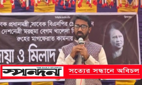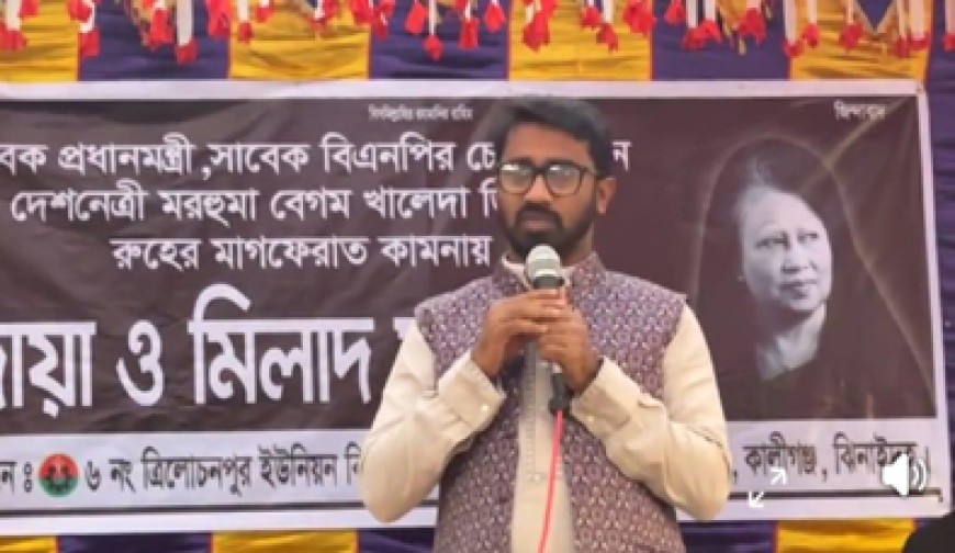 কালীগঞ্জ (ঝিনাইদহ) প্রতিনিধি: ঝিনাইদহের কালীগঞ্জ উপজেলার ত্রিলোচানপুর ইউনিয়নে সাবেক প্রধানমন্ত্রী ও বিএনপি চেয়ারপারসন বেগম খালেদা জিয়ার রুহের মাগফিরাত কামনায় কোরআন খতম, দোয়া মাহফিল ও আলোচনা সভা অনুষ্ঠিত হয়েছে। রোববার (১৮ জানুয়ারি) বিকাল ৩টায় বিএনপির উদ্যোগে এ কর্মসূচি অনুষ্ঠিত হয়। আলোচনা সভায় সভাপতিত্ব করেন উপজেলা বিএনপির নেতা এএইচএম আব্দুল আলীম। সভা পরিচালনা করেন ঝিনাইদহ জেলা ছাত্রদলের সহ-সাংগঠনিক সম্পাদক শাহরিয়ার মাহমুদ বাবু। অনুষ্ঠানে প্রধান অতিথি ছিলেন ঝিনাইদহ-৪ আসনের বিএনপি মনোনীত ধানের শীষ প্রতীকের প্রার্থী রাশেদ খাঁন। বিশেষ অতিথি ছিলেন কালীগঞ্জ উপজেলা বিএনপির সাবেক যুগ্ম আহ্বায়ক আবুল কালাম আজাদ, জেলা বিএনপির উপদেষ্টা মণ্ডলীর সদস্য আশরাফুজ্জামান স্বপন, উপজেলা যুবদলের সদস্য সচিব মাহবুবুর রহমান মিলন, পৌর যুবদলের আহ্বায়ক শাহজাহান আলী খোকন, পৌর বিএনপি নেতা বাবুল আক্তারসহ উপজেলা ও পৌর বিএনপি এবং অঙ্গসংগঠনের নেতৃবৃন্দ। প্রধান অতিথির বক্তব্যে রাশেদ খাঁন বলেন- বিএনপির ভারপ্রাপ্ত চেয়ারম্যান তারেক রহমান দেশের উন্নয়নে একটি মহাপরিকল্পনা গ্রহণ করেছেন। সেই পরিকল্পনা বাস্তবায়নে সবাইকে ঐক্যবদ্ধভাবে কাজ করতে হবে। তিনি আরও বলেন, দলের নির্দেশনা অনুযায়ী জনগণকে সঙ্গে নিয়ে দায়িত্ব পালনে তিনি সকলের সহযোগিতা কামনা করেন। তিনি বলেন-দেশের গণতন্ত্র ও মানুষের ভোটাধিকার প্রতিষ্ঠায় বেগম খালেদা জিয়ার অবদান ইতিহাসে চিরস্মরণীয় হয়ে থাকবে। তিনি ছিলেন আপোষহীন নেতৃত্বের প্রতীক। অনুষ্ঠান শেষে বেগম খালেদা জিয়ার রুহের মাগফিরাত এবং দেশ ও জাতির কল্যাণ কামনা করে বিশেষ দোয়া অনুষ্ঠিত হয়। এতে স্থানীয় বিএনপি ও অঙ্গসংগঠনের নেতাকর্মীরা উপস্থিত ছিলেন।