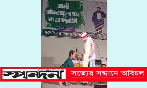 নিজস্ব প্রতিবেদক : মহাকবি মাইকেল মধুসূদন দত্তের ২০২ তম জন্মবার্ষিকীতে যশোরে সাংস্কৃতিক সংগঠন সমুহের ব্যানারে পালিত হয়েছে কর্মসূচি। রোববার সন্ধ্যায় জেলা শিল্পকলা একাডেমি মিলনায়তনে কর্মসূচির মধ্যে ছিল কবির উপর আলোচনা, নাটক, আবৃত্তি ও সংগীতানুষ্ঠান। জন্মবার্ষিকী উদযাপন কমিটির আহবায়ক ও কিংশুক যশোরের সাধারণ সম্পাদক আনোয়ারুল করীম সোহেলের সভাপতিত্বে সংক্ষিপ্ত এই আলোচনা সভায় বক্তব্য রাখেন শব্দ থিয়েটারের সাধারণ সম্পাদক অরুণ মজুমদার ও সুরবিতান সংগীত একাডেমির সাধারণ সম্পাদক অ্যাড. বাসুদেব বিশ্বাস। পরে সাংস্কৃতিক অনুষ্ঠানের শুরুতে পরিবেশিত হয় মহাকবি রচিত নাটক ‘বুড়ো শালিকের ঘাড়ে রো’। নাটক টি নির্দেশনা দিয়েছেন সানোয়ার আলম খান দুলু। নাটক শেষে কবিতা আবৃত্তি আর সংগীতানুষ্ঠান। জেলার বিভিন্ন সংগঠনের শিল্পীরা পরিবেশন মহাভাগ কবি মাইকেল মধুসূদন দত্তের লেখা সংগীত। সব মিলিয়ে দুই ঘন্টার এ অনুষ্ঠানটি উপভোগ করেছে বিপুল সংখ্যক দর্শক।