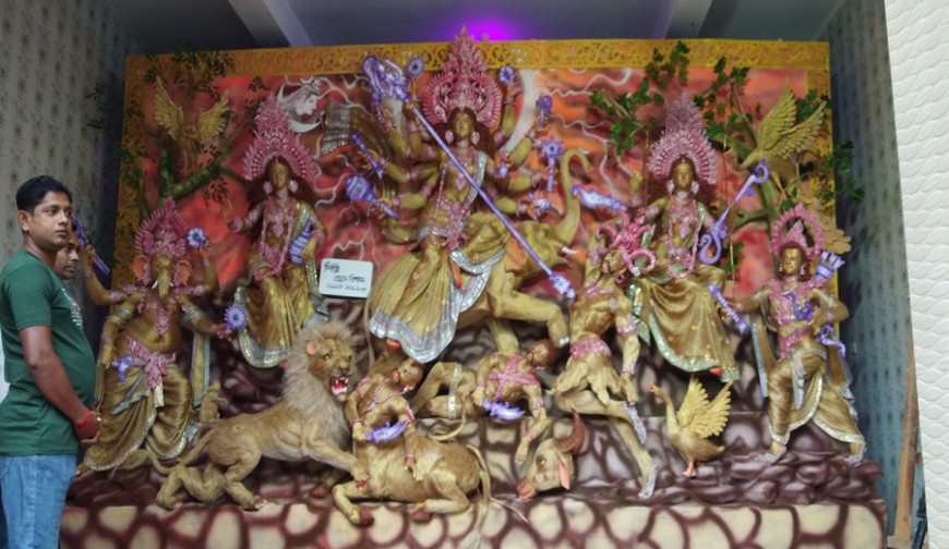কলারোয়া (সাতক্ষীরা) প্রতিনিধি : কলারোয়ার উত্তর মুরারিকাটি পালপাড়ায় দুর্গাপূজায় প্রতিমার শোভাবর্ধনে নতুনত্ব থাকে প্রতিবারই। প্রতিমার জৌলুসে ব্যতিক্রমী সৃষ্টিশীলতায় সম্পূর্ণ ভিন্ন ধারা প্রবর্তন করা হয়ে থাকে এখানে। এরই ধারাবাহিকতায় এবার পালপাড়ার পূজা আয়োজকরা বাংলাদেশের স্বর্ণসূত্র পাটের সোনালি আঁশ বসিয়ে দুর্গাপ্রতিমা তৈরি করিয়েছেন। ২০২৩ সালে চিনিগুঁড়া ধান দিয়ে তৈরির পর গত বছরও বিশেষ লুকে প্রতিমা তৈরি হয়। আর এবার এখানে সবগুলো প্রতিমায় বিশেষ পদ্ধতিতে পরিষ্কার পাটের আঁশ বসিয়ে প্রতিমার শোভাবর্ধন করা হয়েছে। গোটা প্রতিমা প্রায় ৫০ কেজি পাটের আঁশ দিয়ে মোড়ানো হয়েছে। পাটের আঁশের সূক্ষ্ম টানাটানা আঁচড়ও প্রতিমাজুড়ে বিদ্যমান ও দৃশ্যমান হয়েছে । অনেক আগেই এই পূজামণ্ডপে প্রতিমা তৈরি ও রঙের কাজ সম্পন্ন হয়ে গেছে। প্রতিমার রঙেও পাটের আঁশের চিরায়ত রং স্থান পেয়েছে। কলারোয়া পৌরসভাধীন উত্তর মুরারিকাটি পালপাড়া সর্বজনীন পূজামণ্ডপের এই ব্যতিক্রমী সৃজনকর্ম সচক্ষে দেখতে প্রতিদিনই ভিড় জমাচ্ছেন দর্শনার্থীরা। দুর্গা, লক্ষ্মী, সরস্বতী, গণেশ,কার্তিক, অসুর, মহিষাসুরসহ সবকটি প্রতিমা মোড়ানো হয়েছে পাটের আঁশে। সরেজমিনে গিয়ে দেখা যায়, মোট ১২টি প্রতিমা সারি বেঁধে দাঁড়িয়ে আছে। প্রতিটি প্রতিমার গায়ে সোনালি ঝলক। জানা গেছে, পাটের আঁশ ছোটো ছোটো টুকরো করে চিরুনি দিয়ে মসৃণ করা হয়েছে। এরপর মাটির প্রতিমার গায়ে একে একে বসানো হয়েছে আঁশ। রং ব্যবহার প্রায় হয়নি বললেই চলে, পাটের প্রাকৃতিক আভাতে দ্যুতি ছড়াচ্ছে এই পুজামণ্ডপজুড়ে।