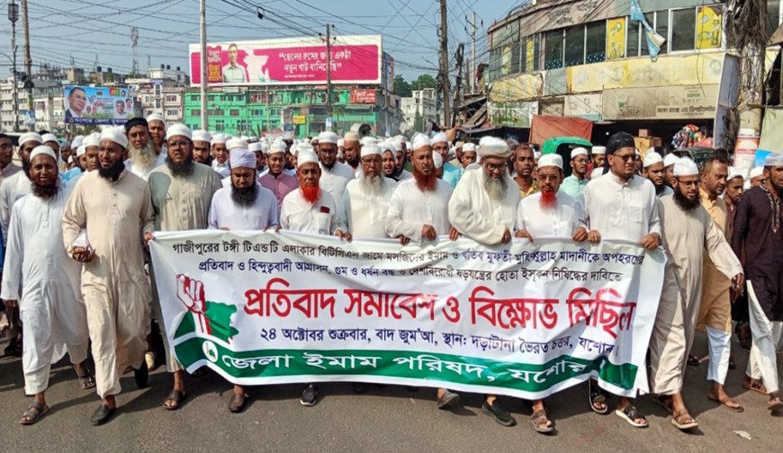 নিজস্ব প্রতিবেদক : মসজিদের ইমাম ও খতিবকে অপহরণের প্রতিবাদ, হিন্দুত্ববাদী আগ্রাসন বন্ধ এবং ইসকন নিষিদ্ধের দাবিতে যশোরে জেলা ইমাম পরিষদের উদ্যোগ বিক্ষোভ সমাবেশ ও মিছিল অনুষ্ঠিত হয়েছে।