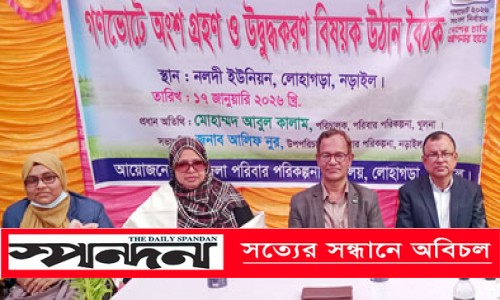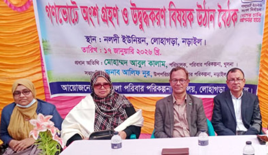 ফরহাদ খান, নড়াইল: নড়াইলের লোহাগড়া উপজেলার নলদী ইউনিয়ন এলাকায় ‘গণভোটে অংশগ্রহণ ও উদ্বুদ্ধকরণ বিষয়ক উঠান বৈঠক’ অনুষ্ঠিত হয়েছে। লোহাগড়া উপজেলা পরিবার পরিকল্পনা বিভাগের আয়োজনে শনিবার (১৭ জানুয়ারি) সকাল থেকে দুপুর পর্যন্ত নলদীর ব্র্রহ্মণীনগর সরকারি প্রাথমিক বিদ্যালয় মাঠে এ উঠান বৈঠক অনুষ্ঠিত হয়। অনুষ্ঠানে প্রধান অতিথি ছিলেন পরিবার পরিকল্পনা, খুলনার পরিচালক মোহাম্মদ আবুল কালাম। পরিবার পরিকল্পনা অধিদপ্তর নড়াইলের উপ-পরিচালক আলিফ নূরের সভাপতিত্বে সভায় দিক-নির্দেশনামূলক বক্তব্য দেন-খুলনার উপ-পরিচালক আকিব উদ্দিন, লোহাগড়া উপজেলা পরিবার পরিকল্পনা কর্মকর্তা তানভীর আহম্মেদ প্লাবনসহ অনেকে। বক্তারা বলেন-আসন্ন ত্রয়োদশ জাতীয় সংসদ নির্বাচনে সাধারণ ভোটের পাশাপাশি গণভোটে অংশ নেয়ার জন্য সবাইকে সচেতন হতে হবে। গণভোট ২০২৬ সংসদ নির্বাচনে দেশের চাবি আপনার হাতে। এজন্য সবাইকে উদ্বুদ্ধ করতে হবে।