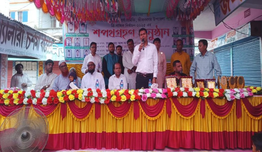 সোমবার দুপুরে উপজেলা নির্বাহী কর্মকর্তার আল আমীন নিজ অফিস কক্ষে নব-নির্বাচিত কমিটির কর্মকর্তাদের শপথ বাক্য পাঠ করান । এ উপলক্ষে মকছুদ সুপার মার্কেটে অনুষ্ঠিত আলোচনা সভার আয়োজন করা হয়। এ সময় প্রধান অতিথি ছিলেন উপজেলা নির্বাহী কর্মকর্তা আলামীন। এ সময় উপস্থিত ছিলেন জীবননগর থানার অফিসার ইনচার্জ ওসি ( তদন্ত) আতিয়ার রহমান , মাধ্যমিক শিক্ষা অফিসের একাডেমিক সুপারভাইজার আব্দুল জব্বার,উপজেলা জুয়েলার্স সমিতির নবনির্বাচিত সভাপতি আলহাজ্ব মোঃ আশাবুল হক, সাধারণ সম্পাদক জুরাইজ রহমান জুনায়েদ, সহ সভাপতি শ্রী নিমাই কুমার দে, সহ সাধারণ সম্পাদক রাফিম হাসনাত সজিব,সাংগঠনিক সম্পাদক শ্রী পংকজ কুমার দত্ত,কোষাধ্যক্ষ শ্রী সাধন কুমার পাল ,প্রচার সম্পাদকমিকাইল হোসেন, সাংস্কৃতিক ও ক্রীড়া সম্পাদক সাহিদ হোসেন, নয়টি ওয়ার্ডের সদস্য বৃন্দসহ সাধারণ ব্যবসায়ী ও সাংবাদিকবৃন্দ।