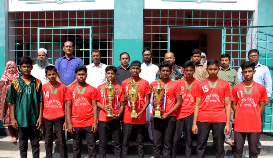 ক্রীড়া প্রতিবেদক: ৫২তম গ্রীষ্মকালীন জাতীয় স্কুল, মাদ্রাসা ও কারিগরি শিক্ষা ক্রীড়া প্রতিযোগিতায় খুলনা বিভাগীয় পর্যায়ে বালক হ্যান্ডবলে রানার্স আপ হয়েছে যশোরের মুসলিম একাডেমী। বুধবার এ বিদ্যালয়ের হয়ে অংশ নেয়া খেলোয়াড়দের সংবর্ধনা দেয়া হয়েছে। বিদ্যালয় প্রাঙ্গণে এক অনুষ্ঠানের মাধ্যমে এসকল কৃতি খেলোয়াড়দের সংবর্ধনা দেয়া হয়। অনুষ্ঠানে অন্যান্যের মধ্যে উপস্থিত ছিলেন মুসলিম একাডেমীর প্রধান শিক্ষক পল্লব কান্তি ঘোষ, সহকারী প্রধান শিক্ষক তপন কুমার তরফদার, সহকারী শিক্ষক এইচ এম ইকবাল হোসেন, জিল্লুর রহমান, তৈয়েবা খাতুন, আব্দুর রাজ্জাক রাজু, আব্দুল জলিল, আক্তারী জামান, প্রদীপ কুমার দত্ত, সালাম আক্তার প্রমুখ। ৫২তম গ্রীষ্মকালীন জাতীয় স্কুল, মাদ্রাসা ও কারিগরি শিক্ষা ক্রীড়া প্রতিযোগিতায় মুসলিম একাডেমী হ্যান্ডবল (বালক) বিভাগে যশোর সদর উপজেলার ফাইনালে যশোর জিলা স্কুলকে ৮-৪ গোলে এবং জেলা পর্যায়ের ফাইনালে চৌগাছা উপজেলাকে ৬-২ গোলে পরাজিত করে। এ জয়ে বিভাগীয় পর্যায়ে খেলার যোগ্যতা অর্জন করেছিলো বিদ্যালয়টি। খুলনা বিভাগীয় পর্যায়ের ফাইনালে কুষ্টিয়া জেলার কাছে ২২-১৯ গোলে পরাজিত হয়ে রানার্স আপ হওয়ার গৌরব অর্জন করে। বিদ্যালয়ের হয়ে খেলায় গালিব হাসান, রাতুল, নিশান, রাকিব, রুহিত, সাবিত। উল্লেখ্য, মুসলিম একাডেমী ২০২২ সালে জাতীয় পর্বে রানার্স আপ হওয়ার গৌরব অর্জন করেছিলো।