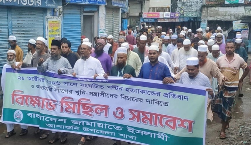 আসর নামাজের পর আশাশুনি সরকারি কলেজ জামে মসজিদের সামনে থেকে বিক্ষোভ মিছিল শুরু হয়। মিছিলটি বিভিন্ন সড়ক ও উপজেলা পরিষদের সামনের সড়ক হয়ে জনতা ব্যাংক মোড়ে সমাবেশ অনুষ্ঠিত হয়। উপজেলা জামায়াতের আমীর ও সদর ইউপির চেয়ারম্যান প্রার্থী আবু মুছা তারিকুজ্জামান তুষারের সভাপতিত্বে সমাবেশে প্রধান মেহমান হিসেবে আলোচনা রাখেন জেলা কর্ম পরিষদ সদস্য ও ল’ ইয়ার্স কাউন্সিল সভাপতি অ্যাড. আব্দুস সোবহান মুকুল। উপজেলা সেক্রেটারী আনওয়ারুল হকের সঞ্চালনায় সমাবেশে অন্যদের মধ্যে আলোচনা রাখেন সাবেক উপজেলা আমীর ও জেলা কর্ম পরিষদ সদস্য উপাধ্যক্ষ আঃ সবুর, সহকারী সেক্রেটারী ডাঃ রোকনুজ্জামান, সাবেক উপজেলা সেক্রেটারী এবিএম আলমগীর পিন্টু, সদর ইউনিয়ন আমীর ও উপজেলা কর্ম পরিষদ সদস্য হাফেজ আব্দুল্লাহ, শ্রীউলা ইউনিয়ন আমীর ও ইউপি চেয়ারম্যান প্রার্থী মাও. লুৎফর রহমান।
