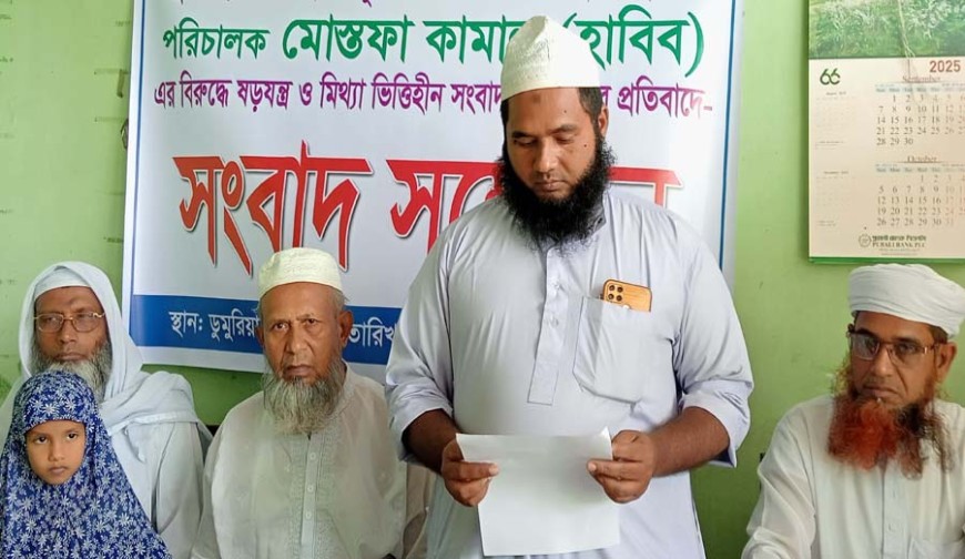 ডুমুরিয়া প্রেসক্লাবে সোমবার সকালে সংবাদ সম্মেলনে লিখিত বক্তব্য পাঠ করেন কুলবাড়িয়া আল হাবিব (সঃ) নুরানী ক্যাডেট স্কীম মাদ্রাসার মুহতামিম মাওলানা মুহাম্মদ মোস্তফা কামাল।