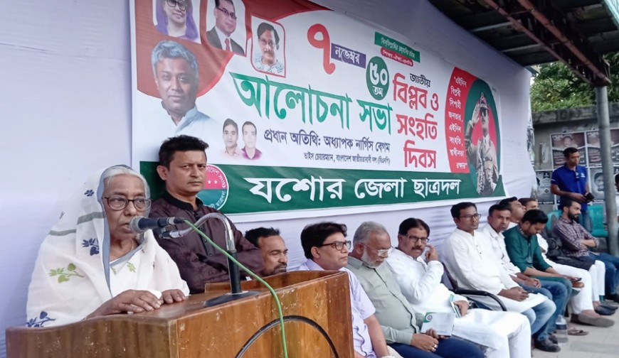 যশোর বিএনপি কার্যালয়ে সামনে অনুষ্ঠিত আলোচনা সভায় অধ্যাপক নার্গিস বেগম আরও বলেন, একাত্তরে জনগণের মধ্যে পাক বাহিনীকে প্রতিরোধ করার চেতনা ছিল, কিন্তু সঠিক নেতৃত্ব ছিলো না। যার যা কিছু আছে তাই নিয়ে ঝাঁিপয়ে পড়ো, এমন বক্তব্যে যুদ্ধের সূচনা হয়নি। মানুষকে কেবল উত্তাপ্ত করা হয়েছে, পথ দেখানো হয়নি। বিশ্বের নাম করা সেনাবাহিনীর বিরুদ্ধে যুদ্ধে নামার প্রস্তুতিও আমাদের ছিল না। এমন সময়ে পাক সেনাবাহিনীর বাঙালি মেজর জিয়াউর রহমান ‘উই রিভোল্ট’ বলে পাক হানাদার বাহিনীর বিরুদ্ধে প্রতিরোধ শুরু করেন। এরপর তিনি মহান স্বাধীনতার ঘোষণা দিয়ে নিজেই অস্ত্র কাঁধে নিয়ে রণাঙ্গণে ঝাঁপিয়ে পড়েন। তার এমন ঘোষণায় এ দেশপ্রেমিক সমগ্র জনতা যুদ্ধে ঝাঁপিয়ে পড়েন। যখন সদ্য স্বাধীন দেশের স্বাধীনতা সার্বভৌমত্ব বিপন্ন হওয়ার উপক্রম হয়। তখন ১৯৭৫ সালের ৭ নভেম্বর দেশের সিপাহী জনতা দেশের স্বাধীনতা সার্বভৌমকত্ব রক্ষার প্রয়োজনীয়তা অনুভব করে তারা সেদিন কাঁধেকাঁধ মিলিয়ে শহীদ রাষ্ট্রপতি জিয়াউর রহমান মুক্ত করেছিলেন। সেদিন তিনি মুক্ত হয়ে দেশের স্বাধীনতা সার্বভৌমত্বকে সুরক্ষা দিয়েছিলেন।