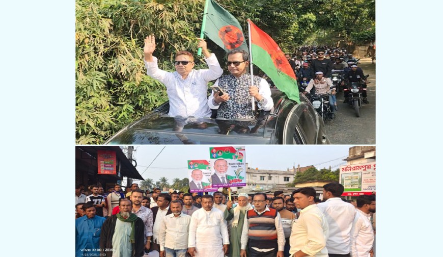 তারই অংশ হিসাবে দুপুর ১টায় বিএনপির মনোনয়ন প্রত্যাশী উপজেলা বিএনপির সাধারণ সম্পাদক আসাদুজ্জামান মিন্টুর নেতৃত্বে মোটর শোভাযাত্রা বের হয়। শোভাযাত্রায় দলীয় নেতাকর্মীরা ছাড়াও বিভিন্ন শ্রেণী পেশার মানুষ অংশ নেন। মনিরামপুর বাজার থেকে শুরু হয়ে শোভাযাত্রাটি নির্বাচনী এলকার গুরুত্বপূর্ণ বাজারগুলো প্রদক্ষিণ করে। এসময় ধানের শীষের পক্ষে স্লোগান দেন বহরে অংশ গ্রহণকারীরা। শোভাযাত্রাটি উপজেলার খানপুরে গিয়ে শেষ হয়। সেখানে বক্তব্য রাখেন মনোনয়ন প্রত্যাশী ও উপজেলা বিএনপির সাধারণ সম্পাদক আসাদুজ্জামান মিন্টু। পরে সেখানে উপজেলায় বিগত সরকারের সময় পুলিশ ও আওয়ামী লীগের নেতাকর্মীদের হাতে নির্যাতিত হয়ে মৃত্যুবরণকারী নেতাদের শান্তিকামনায় দোয়া মাহফিল অনুষ্ঠিত হয়। মনোনয়ন প্রত্যাশী আসাদুজ্জামান মিন্টু বলেন, ‘তিনি বিগত ১৭ বছর নির্যাতিত নেতাকর্মীদের পাশে ছিলেন। এলাকার উন্নয়নে ভূমিকা রেখেছেন। দল তার উপর আস্থা রাখলে এ আসনটি পুরুদ্ধার করতে পারবেন তিনি।’