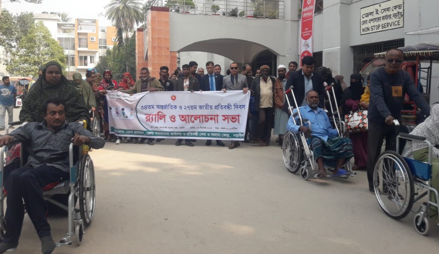 নড়াইল পৌর প্রতিনিধি : নড়াইলে ৩৪তম আন্তর্জাতিক ও ২৭তম জাতীয় প্রতিবন্ধী দিবস পালিত হয়েছে।দিবসটি পালন উপলক্ষ্যে বুধবার সকাল সাড়ে ১০টায় জেলা প্রশাসন, জেলা সমাজসেবা কার্যালয় ও প্রতিবন্ধী সেবা ও সাহায্য কেন্দ্রের উদ্যোগে জেলা প্রশাসকের কার্যালয়ের সামনে থেকে র্যালি বের হয়। র্যালি শুরুর আগে ১১ নারী ও পুরুষ প্রতিবন্ধীকে বিনামূল্যে হুইল চেয়ার, একজনকে এলবো ক্রাচ ও অপর একজনকে ওয়াকার প্রদান করা হয়। পরে জেলা প্রশাসকের সম্মেলন কক্ষে অনুষ্ঠিত আলোচনা সভায় সভাপতিত্ব করেন জেলা সমাজসেবা কার্যালয়ের উপ-পরিচালক জেড.এম মিজানুর রহমান খান। প্রধান অতিথি হিসেবে বক্তব্য দেন জেলা প্রশাসক ড. মোহাম্মদ আব্দুল ছালাম। নড়াইল সদর হাসপাতাল সমাজ সেবা কর্মকর্তা তমা রায়ের সঞ্চালনায় বিশেষ অতিথি হিসেবে বক্তৃতা করেন অতিরিক্ত জেলা প্রশাসক (সার্বিক) লিংকন বিশ্বাস। আরও বক্তৃতা করেন জেলা সমাজসেবা কার্যালয়ের সহকারী পরিচালক এ.টি.এম মাসুদ হোসেন।উপস্থিত ছিলেন শহর সমাজসেবা অফিসার মো: সুজা উদ্দিন,সরকারি শিশু পরিবারের উপ-তত্ত্বাবধায়ক আসাদুল্লাহসহ অন্যান্য কর্মকর্তাগণ।