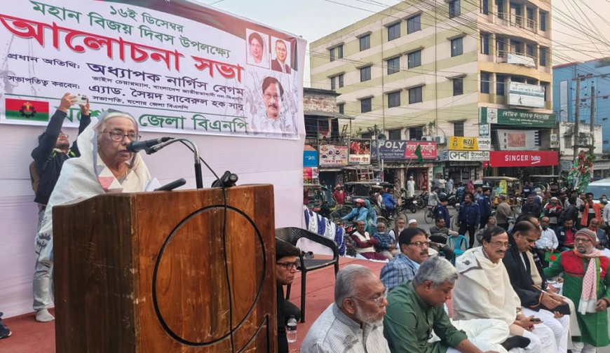 নিজস্ব প্রতিবেদক : মহান বিজয় দিবসের আলোচনা সভায় বিএনপির ভাইস চেয়ারম্যান অধ্যাপক নার্গিস বেগম বলেছেন- বাংলাদেশ আমাদের রক্তের বিনিময়ে অর্জিত, কারও দয়ার দান নয়। এই দেশকে নিরাপদ রাখা স্বাধীনতা সার্বভৌমত্ব অক্ষুন্ন রাখার দায়িত্ব আমাদের সকলের। চব্বিশের রক্তাক্ত গণঅভ্যুত্থানে ফ্যাসিস্ট শেখ হাসিনার পতনের মাধ্যমে প্রাথমিক বিজয় অর্জিত হয়েছে। সমগ্র জাতি নতুন সূর্যোদয় দেখার জন্য উন্মুখ হয়ে আছে। কাঙ্খিত গণতান্ত্রিক বাংলাদেশ বির্নিমাণের জন্য দেশবাসী প্রতীক্ষমাণ। আগামী ২০২৬ সালের ফেব্রুয়ারি মাসে নির্বাচন হতে যাচ্ছে। এই নির্বাচনের মাধ্যমে নির্ধারিত হবে বাংলাদেশ আগামী দিনে কোন পথে যাবে। প্রিয় দেশবাসী সতর্ক থাকুন, যারা বাংলাদেশের জন্ম মুহুর্ত থেকে ষড়যন্ত্র করছে এবং চব্বিশের গণঅভ্যূত্থানের পর পালিয়ে থেকে চক্রান্ত করে আমাদের গণতান্ত্রিক যাত্রাকে নস্যাৎ করতে চায়। কোন ভাবেই দেশ বিরোধী চক্রান্ত ও ষড়যন্ত্রকারীরা সফল হতে না পারে। কেউ যেন পেছনের দরজা দিয়ে ক্ষমতায় যেতে না পারে। আবার যেন কোনদিন স্বৈরাচারের কালো ছাঁয়া আমাদের মাথার ওপর তুলতে না পারে।