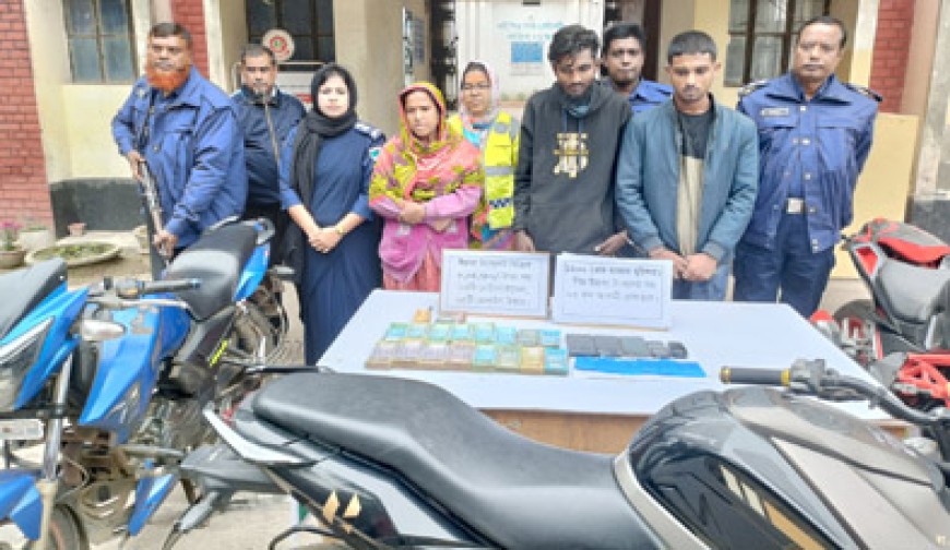 নিজস্ব প্রতিবেদক,মহেশপুর :ঝিনাইদহের মহেশপুর থানা পুলিশ শনিবার ভোর রাতে যুগিহুদা গ্রামের মাদক ব্যবসায়ী দেলোয়ারের আস্তানায় অভিযান চালিয়ে ১২শ’ পিস ইয়াবা ও ইয়াবা বিক্রির ৮ লাখ ৪ হাজার ৮৭০ টাকা উদ্ধার করেছে। এ সময় ৩টি মোটর সাইকেল ও ৫টি মোবাইল ফোনসহ ৩ জনকে আটক করা হয়। আটককৃতরা হলো-যুগিহুদা গ্রামের দেলোয়ার হোসেনের স্ত্রী লাইলী বেগম (৩৭), ছেলে লিমন হাসান (২৩) ও জলিলপুর গ্রামের জাকির হোসেনের ছেলে মেহেদী হাসান জিসানকে (২৫)। পুলিশ জানায়-দেলোয়ার হোসেন এলাকার একজন কুখ্যাত মাদক ব্যবসায়ী। পুলিশের উপস্থিতি টের পেয়ে দেলোয়ার হোসেন পালিয়ে গেলেও তার স্ত্রী লাইলী বেগম, ছেলে লিমন হাসান ও জলিলপুর গ্রামের ইয়াবা ব্যবসায়ী মেহেদী হাসান জিসানকে আটক করা হয়। মহেশপুর থানার অফিসার ইনচার্জ (ওসি) মেহেদী হাসান জানান-পুলিশের একটি বিশেষ দল গোপন সংবাদের ভিত্তিতে ভোর রাতে যুগিহুদা গ্রামের দেলোয়ারের বাড়ি ঘিরে ফেলে অভিযান শুরু করে। অভিযানের আগে কুখ্যাত মাদক ব্যবসায়ী দেলোয়ার হোসেন পালিয়ে যায়। তবে দেলোয়ারকে ধরতে অভিযান চলছে।