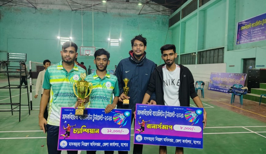 ক্রীড়া প্রতিবেদক : জেলা প্রশাসন ও মাদকদ্রব্য নিয়ন্ত্রণ অধিদপ্তর যশোরের আয়োজনে মাদকবিরোধী ১৬ দলীয় ব্যাডমিন্টন টুর্নামেন্ট অনুষ্ঠিত হয়েছে। রোববার দিনব্যাপী স্থানীয় জিমনেসিয়ামে (ইনডোর) অনুষ্ঠিত হয় এ টুর্নামেন্ট। টুর্নামেন্টে অংশ নেয় ১৬ টি দলে। চাম্পিয়ন হয়েছেন অন্তু‘ ও রাফি এবং রানার্স আপ হন সামি ও জাহিদ জুটি। ম্যান অফ দ্যা টুর্নামেন্ট হয়েছেন অন্তু। চ্যাম্পিয়ন দলকে ১২ হাজার টাকা ও ট্রফি এবং রানার্স আপ দরকে ৮ হাজার টাকা ও ট্রফি দেয়া হয়। খেলা শেষে উপপরিচালক পারভীন আখতার মাদকের কুফল ও প্রতিকার সম্পর্কে বক্তব্য প্রদান করেন। পরে খেলোয়াড় ও উপস্থিত দর্শকদের সঙ্গে নিয়ে ‘মাদকবিরোধী শপথ বাক্য’ পাঠ করান। পুরস্কার বিতরনী অনুষ্ঠানে প্রধান অতিথি ছিলেন যশোরের জেলা প্রশাসক মোহাম্মদ আশেক হাসান। সভাপতিত্ব করেন যশোর মাদকদ্রব্য নিয়ন্ত্রণ অধিদপ্তরের উপপরিচালক পারভীন আখতার। উল্লেখ্য, খেলায় বাংলাদেশ জাতীয় ব্যাডমিন্টন দলের ৪ জন প্রমিলা সদস্য মাধুর্য, মুগ্ধ, ঐশি ও কুয়াশা অংশগ্রহণ করেন।