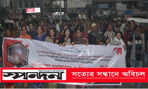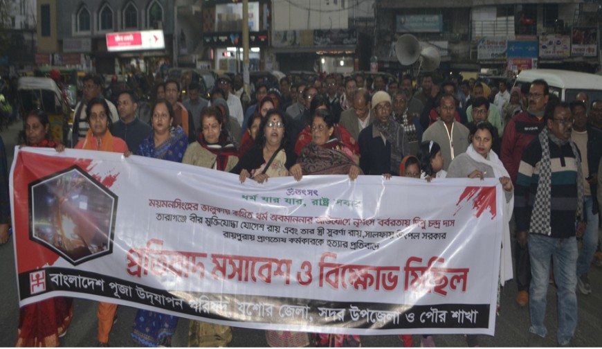নিজস্ব প্রতিবেদক : ময়মনসিংহের ভালুকায় কথিত ধর্ম অবমাননার অভিযোগে নৃশংস বর্বরতায় দিপু চন্দ্র দাসসহ বিভিন্ন হত্যার প্রতিবাদে মঙ্গলবার বিকালে যশোর শহরে বিক্ষোভ সমাবেশ ও মিছিল করে বাংলাদেশ পূজা উদযাপন পরিষদ।