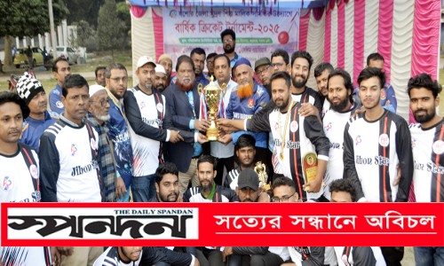 ক্রীড়া প্রতিবেদক : যশোর জেলা মুদ্রণ শিল্প মালিক সমিতির আয়োজনে বার্ষিক ক্রিকেট টুর্নামেন্ট অনুষ্ঠিত হয়েছে। শুক্রবার পলিটেকনিক ইনস্টিটিউট মাঠে অনুষ্ঠিত খেলায় চ্যাম্পিয়ন হয়েছে জীবন স্টার ও রানার্স আপ হয় রানা কিংস। দিনব্যাপী এ টুর্নামেন্টে অংশ নেয় ৪ টি দল। অন্য দলগুলি-সেলিম টাইগার্স ও সেলিম ওয়ারিয়ার্স। ফাইনালে প্রথমে ব্যাট করে নির্ধারিত ৮ ওভারে ৩ উইকেট হারিয়ে ১৩৫ রান করে রানা কিংস। জবাবে, ৭ ওভারে মাত্র একটি উইকেট হারিয়ে জয় পায় জীবন স্টার। ৯ উইকেটের জয় নিয়ে চ্যাম্পিয়ন হয় জীবন স্টার। সকালে উদ্বোধন ও বিকেলে পুরস্কার বিতরণী অনুষ্ঠানে অন্যান্যের মধ্যে উপস্থিত ছিলেন, যশোর জেলা মুদ্রণ শিল্প মালিক সমিতির সাবেক সভাপতি সাব্বির মালিক বাবু,বর্তমান সহসভাপতি সুলতান আহম্মেদ ও শলিফুল ইসলাম শরিফ, সাধারণ সম্পাদক শাহিন শাহ রানা, সহ-সাধারণ সম্পাদক ইসহাক আলী বাবু, সাংগাঠনিক সম্পাক ফিরোজ উদ্দিন লাল্টু, কোষাধ্যক্ষ ফিরোজ উদ্দিন তোতা, দফতর সম্পাদক ইসরাফিল হোসেন, ক্রীড়া সম্পাদক কাশেম আলী প্রমুখ।