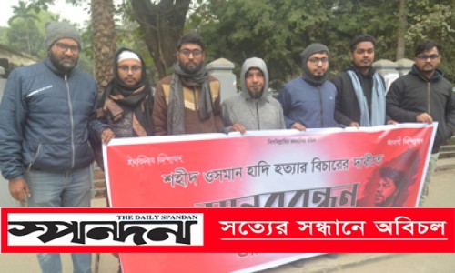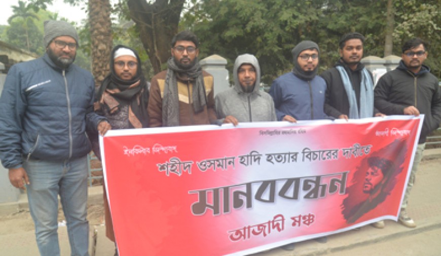 নিজস্ব প্রতিবেদক : যশোরের বিপ্লবী ছাত্রজনতার পক্ষে হাদি হত্যাকাণ্ডের বিচারের দাবিতে মানববন্ধন কর্মসূচি পালিত হয়েছে। সোমবার বিকেলে প্রেসক্লাব যশোরের সামনে এ মানববন্ধন করা হয়। মানববন্ধনে উপস্থিত নেতাকর্মীরা আমার ভাই কবরে খুনি কেন বাহিরে, গোলামি না আজাদি, সেফ হাউজ ট্রেরারিস্ট ইন্ডিয়া ইন্ডিয়াসহ নানা ধরণের স্লোগান দেয়। পরে শহরে মিছিল বের করা হয়। মানববন্ধনে নেতাকর্মীরা বলেন- সন্ত্রাসী হত্যাকাণ্ডের শিকার শহীদ ওসমান হাদির হত্যাকারিদের দ্রুত সময়ের মধ্যে ভারত থেকে ফিরিয়ে এনে বিচার নিশ্চিত করতে হবে। কোনো ভাবেই এই বিচার নিয়ে তালবাহানা করা যাবে না। মানববন্ধনে উপস্থিত ছিলেন সোহান খান, তামিম হাসান, মেহেদি হাসান, মো. রিমন, ফেরদৌস পরশ, আশা লতা, আসমা খাতুন প্রমুখ।
