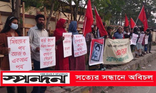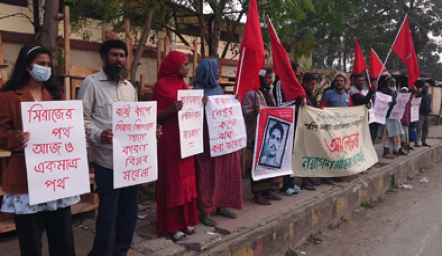 নিজস্ব প্রতিবেদক : মহান মাওবাদী নেতা শহীদ কমরেড সিরাজ সিকদারের মৃত্যুবার্ষিকী উপলক্ষে নয়া গণতান্ত্রিক গণমোর্চার উদ্যোগে যশোরে জাতীয় শহীদ দিবস পালিত হয়েছে। শুক্রবার বিকেলে যশোর শহরের রেলরোড ফুড গোডাউনের সামনে এ উপলক্ষে আলোচনা সভা অনুষ্ঠিত হয়। সভায় সভাপতিত্ব করেন নয়াগণতান্ত্রিক গণমোর্চার কেন্দ্রীয় জাতীয় কমিটির সদস্য কমরেড খবির শিকদার। বিপ্লবী ছাত্র যুব আন্দোলন যশোরের সদস্য সুরাইয়া শিকদার এশার সঞ্চালনায় সভায় আরও বক্তব্য রাখেন দেশপ্রেমিক সৈয়দ মোস্তফা ফারুক, রবিউল ইসলাম, বিপ্লবী ছাত্র যুব আন্দোলনের নেতা সুমাইয়া শিকদার ইলা, রাইয়ান রশিদ আবির, নারায়ণ চন্দ্র সিংহ, কেরামত গাজী, মোখলেসুর রহমান, মোহাম্মদ রাশেদুল মধু, আব্দুল জলিল আবুবক্কার, তুজাম উদ্দিন, আব্দুল কুদ্দুস প্রমুখ। সভায় বক্তারা শহীদ কমরেড সিরাজ সিকদারসহ দেশের বিভিন্ন গণতান্ত্রিক ও রাজনৈতিক সভায় যশোরের প্রগতিশীল লেখক ও চিন্তাবিদ দেবু মল্লিকের গ্রেপ্তারে উদ্বেগ প্রকাশ করে তার দ্রুত মুক্তির দাবি জানানো হয়। কর্মসূচি শেষে কমরেড সিরাজ সিকদারসহ সকল শহীদ ও প্রয়াত বিপ্লবীদের স্মরণে জাতীয় শহীদ দিবস পালন করা হয়।
