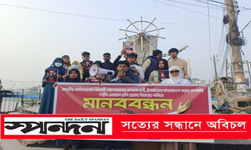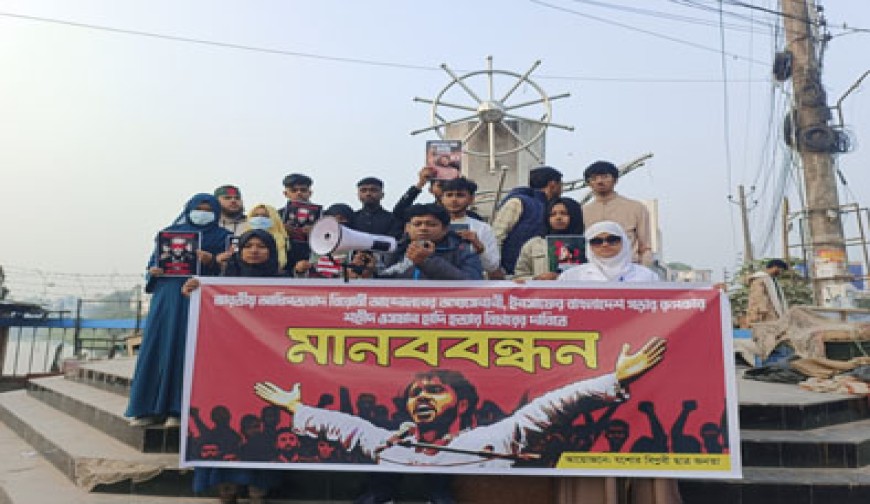 প্রেসবিজ্ঞপ্তি : ইনকিলাব মঞ্চের মুখপাত্র শহীদ শরীফ ওসমান হাদি হত্যার বিচারের দাবিতে যশোরে মানববন্ধন হয়েছে। শনিবার বিকেলে শহরের দড়াটানা ভৈরব চত্বরে বিপ্লবী ছাত্রজনতার ব্যানারে মানববন্ধন কর্মসূচি পালিত হয়। মানববন্ধনে বক্তারা বলেন, ওসমান হাদিকে যে হাত গুলি করেছে, সেই হাতের পেছরে ভারত আছে; সেই হাতের পেছনে এ দেশের নব্য ভারতীয় দালালরা রয়েছে। আওয়ামী লীগ ও ভারতীয় গোয়েন্দা সংস্থা ‘র’-সহ তাদের নব্য এজেন্টরা এই হত্যায় সরাসরি জড়িত। এই এন্টেরিম গর্ভমেন্টে লুকিয়ে থাকা ভারতীয় দালালরা হাদি হত্যার নীলনকশা করেছে। যার কারণে ১৬দিন অতিবাহিত হতে গেলেও হত্যাকাণ্ডে জড়িতরা ধরা ছোঁয়ার বাইরে রয়ে গেছে। মানববন্ধন শেষে বক্তব্য রাখেন গণমাধ্যমকর্মী সালমান হাসান রাজিব, জাতীয় নাগরিক পার্টির (এনসিপি) জেলা সমন্বয় কমিটির সদস্য আসমা ইসলাম, শিক্ষার্থী মাহামুদুল হক সোহান, আমিনুল হক তামিম, মেহজাবিন জান্নাত অনন্যা, হাবিব আহমেদ শান, মেহেদী হাসান রূপম প্রমুখ।