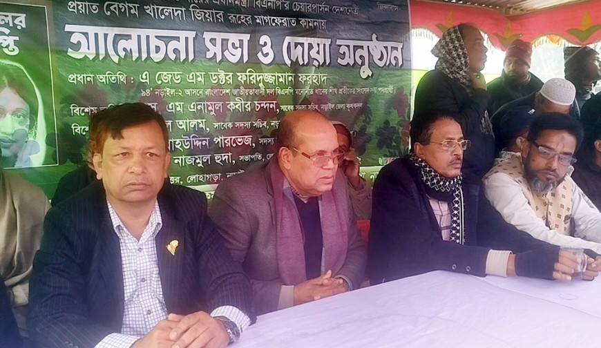 ফরহাদ খান ও মাহফুজুল ইসলাম মুন্নু, নড়াইল : নড়াইলের লোহাগড়া উপজেলার লক্ষ্মীপাশায় বিএনপি চেয়ারপারসন সাবেক প্রধানমন্ত্রী বেগম খালেদা জিয়ার আত্মার মাগফিরাত কামনায় আলোচনা সভা ও দোয়া মাহফিল অনুষ্ঠিত হয়েছে। লোহাগড়া উপজেলা ও পৌর কৃষকদলের উদ্যোগে সোমবার (৫ জানুয়ারি) দুপুরে উপজেলা গেট চত্বরে এ অনুষ্ঠানের আয়োজন করা হয়। অনুষ্ঠানে প্রধান অতিথির বক্তব্য রাখেন, নড়াইল-২ আসনে বিএনপির প্রার্থী ড. এ জেড এম ফরিদুজ্জামান ফরহাদ।