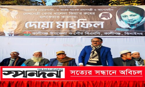 কালীগঞ্জ (ঝিনাইদহ) প্রতিনিধি: ঝিনাইদহের কালীগঞ্জে বিএনপির চেয়ারপার্সন, তিনবারের সাবেক প্রধানমন্ত্রী ও দেশনেত্রী বেগম খালেদা জিয়ার রুহের মাগফেরাত কামনায় দোয়া মাহফিল অনুষ্ঠিত হয়েছে। উপজেলা ও পৌর বিএনপির আয়োজনে বুধবার বিকেলে শহরের থানা রোডস্থ বিএনপি দলীয় কার্যালয় সংলগ্ন চিত্রা নদীর পাড়ে এ দোয়া মাহফিল অনুষ্ঠিত হয়। উপজেলা বিএনপি নেতা নজরুল ইসলাম তোতার সভাপতিত্বে আয়োজিত দোয়া মাহফিলে প্রধান অতিথি হিসেবে উপস্থিত ছিলেন কেন্দ্রীয় স্বেচ্ছাসেবক দলের যুগ্ম সম্পাদক ও ত্রয়োদশ জাতীয় সংসদ নির্বাচনে ঝিনাইদহ-৪ আসনের স্বতন্ত্র প্রার্থী সাইফুল ইসলাম ফিরোজ। অনুষ্ঠানটি পরিচালনা করেন হাফেজ বাসার উদ্দিন। দোয়া মাহফিলে সঞ্চালনায় ছিলেন উপজেলা বিএনপির সাবেক যুগ্ম আহ্বায়ক ইলিয়াস রহমান মিঠু এবং পৌর ছাত্রদলের আহ্বায়ক জুয়েল রানা।