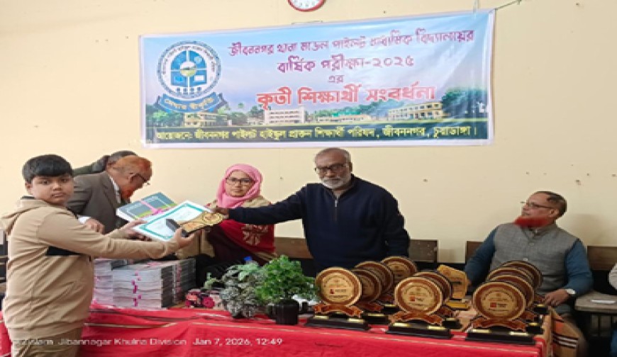জীবননগর প্রতিনিধি : জীবননগর থানা মডেল পাইলট মাধ্যমিক বিদ্যালয়ে ২০২৫ সালের বার্ষিক ও নির্বাচনী পরীক্ষায় কৃতিত্ব অর্জনকারী শিক্ষার্থীদের মাঝে পুরস্কার বিতরণ করা হয়েছে। গত বুধবার অনুষ্ঠানে শিক্ষার্থীদের নিয়মিত উপস্থিতি, শৃঙ্খলা ও শিক্ষায় সাফল্যের স্বীকৃতিস্বরূপ পুরস্কার প্রদান করা হয়। এছাড়া দরিদ্র ও মেধাবী শিক্ষার্থী ইয়াসিন আরাফাতকে ১০ হাজার টাকা শিক্ষাবৃত্তি দেয়া হয়। নতুন বছরের শুভেচ্ছা হিসেবে বিদ্যালয়ের প্রধান শিক্ষক সকল শিক্ষার্থী, শিক্ষক ও আমন্ত্রিত অতিথিদের হাতে নতুন বছরের ক্যালেন্ডার তুলে দেন। সভাপতিত্ব করেন জীবননগর থানা মডেল পাইলট মাধ্যমিক বিদ্যালয়ের প্রধান শিক্ষক (ভারপ্রাপ্ত) রেবেকা সুলতানা। প্রধান অতিথি ছিলেন জীবননগর জীবননগর পাইলট হাইস্কুল প্রাক্তন শিক্ষার্থী পরিষদের আহ্বায়ক আমিন উদ্দীন। বিশেষ অতিথি ছিলেন এসএসসি ৮১ ব্যাচের শিক্ষার্থী মো. আব্দুর রাজ্জাক, অনুষ্ঠান আয়োজন কমিটির আহ্বায়ক ও ৭৯ ব্যাচের শিক্ষার্থী আরসাফুল হক, ৯০ ব্যাচের শিক্ষার্থী আবুল কালাম আজাদ, ৯৫ ব্যাচের শিক্ষার্থী আরিফ। অনুষ্ঠান সঞ্চালনা করেন জীবননগর ডিগ্রি কলেজের প্রভাষক ও ৯০ ব্যাচের শিক্ষার্থী তারিক আনাম ও জীবননগর পাইলট হাইস্কুল প্রাক্তন শিক্ষার্থী পরিষদের সদস্যসচিব এস এম মাহবুবুর রহমান।