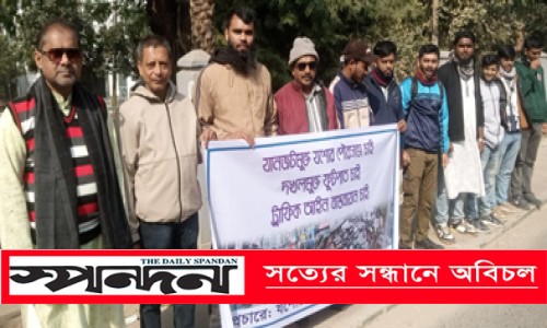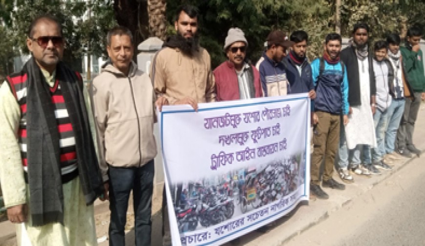 নিজস্ব প্রতিবেদক : যশোরে যানজট নিরসন, দখলমুক্ত ফুটপাত নিশ্চিতকরণ এবং ট্রাফিক আইন কঠোরভাবে বাস্তবায়নের দাবিতে যশোরে মানববন্ধন কর্মসূচি পালন করেছে সচেতন নাগরিক সমাজ। শুক্রবার সকাল ১১টায় সংগঠনটির আয়োজনে এ মানববন্ধন অনুষ্ঠিত হয়। মানববন্ধনে বক্তারা বলেন-যশোর শহরে প্রতিদিনই যানজট ভয়াবহ আকার ধারণ করছে। এতে সাধারণ মানুষের চলাচলে চরম ভোগান্তি সৃষ্টি হচ্ছে। ফুটপাত দখল, অবৈধ পার্কিং ও ট্রাফিক আইন অমান্যই এই যানজটের প্রধান কারণ। অবিলম্বে ফুটপাত দখলমুক্ত করা এবং ট্রাফিক আইন কার্যকরভাবে বাস্তবায়নের জন্য প্রশাসনের প্রতি জোর দাবি জানান তারা। মানববন্ধনে উপস্থিত ছিলেন নিরাপদ সড়ক আন্দোলন (নিসআ) যশোর জেলা শাখার আহ্বায়ক মাহমুদ হাসান, সদস্য সচিব মো.সাকিব রহমান, যুগ্ম আহ্বায়ক মোহাম্মদ আমিনুল ইসলাম ও বি.এম. সাগর হোসাইন, যুগ্ম সদস্য সচিব রিয়াদ হোসেন, এম.এম. রাফিকুল হাসান, মণিরামপুর উপজেলা সদস্য সচিব জোবায়ের নাইমসহ বিভিন্ন সামাজিক সংগঠনের নেতৃবৃন্দ। বক্তারা হুঁশিয়ারি দিয়ে বলেন-দ্রুত কার্যকর ব্যবস্থা না নিলে বৃহত্তর কর্মসূচির মাধ্যমে দাবি আদায় করা হবে।