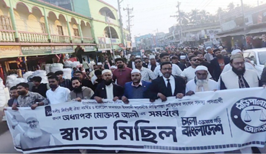 কেশবপুর প্রতিনিধি : কেশবপুরে ১০ দলীয় নির্বাচনী ঐক্যজোট সমর্থিত ও জামায়াতে ইসলামী মনোনীত দাঁড়িপাল্লা প্রতীকের সংসদ সদস্য প্রার্থী অধ্যাপক মোক্তার আলীর সমর্থনে স্বাগত মিছিল অনুষ্ঠিত হয়েছে। বৃহস্পতিবার বিকেলে শহরের পাবলিক ময়দান থেকে ওই মিছিলটি শুরু হয়ে শহর প্রদক্ষিণ করে পৌরসভা মোড়ে এসে শেষ হয়। পরে ওই স্থানে আলোচনা সভায় পৌর জামায়াতের আমির প্রভাষক জাকির হোসেনের সভাপতিত্বে বক্তব্য দেন যশোর-৬ কেশবপুর আসনে দাঁড়িপাল্লা প্রতীকের প্রধান নির্বাচনী এজেন্ট সাইদুর রহমান সাইদ ও উপজেলা এনসিপির প্রধান সমন্বয়কারী সম্রাট হোসেন। এ সময় উপস্থিত ছিলেন উপজেলা জামায়াতের সেক্রেটারি মাস্টার রফিকুল ইসলাম, নায়েবে আমির মাওলানা রেজাউল ইসলাম, পেশাজীবী বিভাগের সভাপতি অ্যাডভোকেট ওজিয়ার রহমান, কর্মপরিষদ সদস্য প্রভাষক আব্দুস সাত্তার, কৃষিবিদ তাজামুল ইসলাম দীপু প্রমুখ।