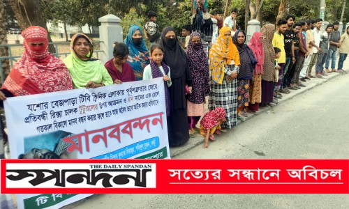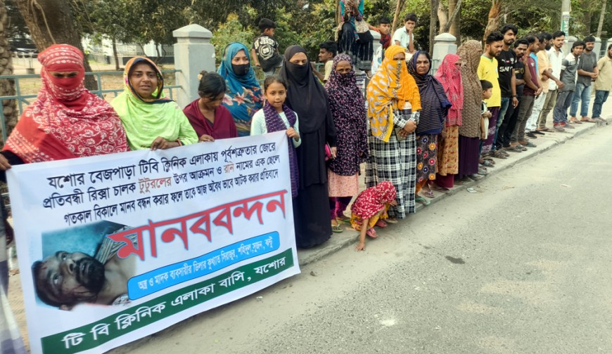 নিজস্ব প্রতিবেদক : যশোর শহরের বেজপাড়া টিবি ক্লিনিক এলাকায় পূর্বশত্রুতার জেরে এক প্রতিবন্ধী রিকশাচালকের ওপর হামলা এবং মানববন্ধন করার জেরে এক যুবককে অবৈধভাবে আটকের প্রতিবাদে মানববন্ধন করেছে এলাকাবাসী।