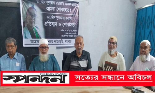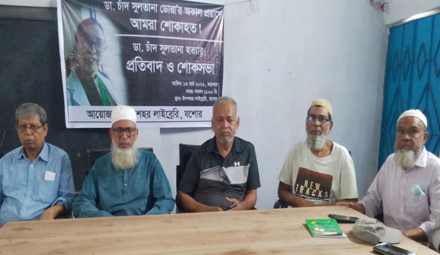 নিজস্ব প্রতিবেদক : ডাক্তার চাঁদ সুলতানা ডোরা হত্যার প্রতিবাদে যশোর উপশহর লাইব্রেরির উদ্যোগে শুক্রবার সকালে স্থানীয় ইন্সটিটিউট স্কুলে প্রতিবাদ ও শোকসভার আয়োজন করা হয়। সভায় ডা. চাঁদ সুলতানা ডোরার হত্যার বিচারের দাবিতে বিএমএ’র কাছে স্মারকলিপি দেয়ার সিদ্ধান্ত নেয়া হয়।