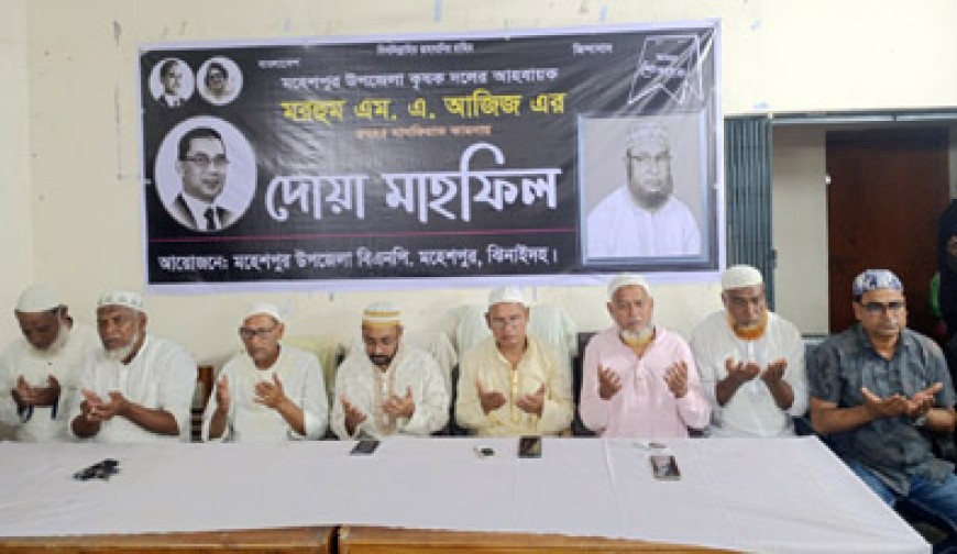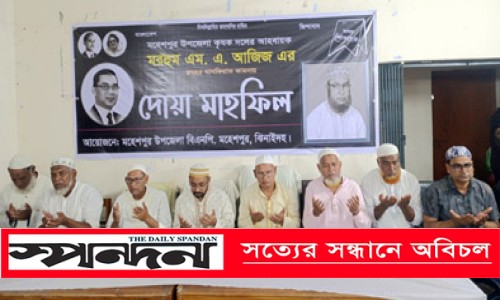 নিজস্ব প্রতিবেদক,মহেশপুর : ঝিনাইদহের মহেশপুর উপজেলা কৃষক দলের আহবায়ক আব্দুল আজিজের মৃত্যুতে উপজেলা বিএনপির উদ্যোগে দোয়া মাহফিল অনুষ্ঠিত হয়েছে। রোববার বিকালে মহেশপুর উপজেলা মাধ্যমিক শিক্ষক সমিতি ভবনে অনুষ্ঠিত দোয়া মাহফিল অনুষ্ঠানে প্রধান অতিথি ছিলেন উপজেলা বিএনপির সভাপতি মেহেদী হাসান রনি। দোয়া মাহফিল অনুষ্ঠানে বিশেষ অতিথি ছিলেন উপজেলা বিএনপির সাধারণ সম্পাদক দবির উদ্দীন বিশ্বাস, পৌর বিএনপির সভাপতি অ্যাড. আমিরুল ইসলাম খান চুন্নু, সাধারণ সম্পাদক সাইফুল ইসলাস,উপজেলা বিএনপির সাংগঠনিক সম্পাদক জিয়াউর রহমান জিয়া, পৌর বিএনপির সাংগঠনিক সম্পাদক সোহাগ খান, শ্যামকুড় ইউনিয়ন বিএনপির সভাপতি শাহানুর আলম,নেপা ইউনিয়ন বিএনপির সভাপতি আমিনুর রহমান,বাঁশবাড়ীয়া ইউনিয়ন বিএনপির সভাপতি সোজানুর রহমান সুজা, পান্তাপাড়া ইউনিয়ন ইউনিয়ন বিএনপির সভাপতি রুহুল আমিন, উপজেলা যুবদলের সদস্য সচিব আব্দুল্লাহ আল ফারুক বাবু, উপজেলা ছাত্রদলের সভাপতি কামরুজ্জামান রতন, সাধারণ সম্পাদক আব্দুল মালেকসহ মহেশপুর উপজেলার ১২টি ইউনিয়ন ও পৌর বিএনপি এবং অঙ্গ সংগঠেনের নেতৃবৃন্দ।