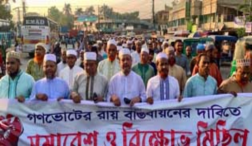 ফুলতলা (খুলনা) প্রতিনিধি: গণভোটের রায় বাস্তবায়নের দাবিতে কেন্দ্রীয় কর্মসূচির অংশ হিসেবে রোববার বিকালে ১১দলীয় জোটের উদ্যোগে ফুলতলা বাজারে এক বিক্ষোভ মিছিল অনুষ্ঠিত হয়। মিছিল শেষে বাজারের আইডিয়াল মোড়ে ফুলতলা উপজেলা জামায়াতের আমীর অধ্যাপক আঃ আলিম মোল্যার সভাপতিত্বে অনুষ্ঠিত সমাবেশে প্রধান অতিথির বক্তৃতা করেন খুলনা জেলা জামায়াতের সহকারী সেক্রেটারী প্রিন্সিপাল গাওসুল আযম হাদী। সেক্রেটারী মাওলানা সাইফুল হাসান খাঁনের পরিচালনায় সমাবেশে অন্যান্যের মধ্যে বক্তৃতা করেন জেলা জামায়াতের যুব বিভাগের সভাপতি অধ্যাপক গোলাম মোস্তফা আল মুজাহিদ, খানজাহান আলী থানা আমীর ডাঃ সৈয়দ হাসান মাহমুদ টিটো, ফুলতলা উপজেলা নায়েবে আমীর অধ্যাপক মাওলানা শেখ ওবায়দুল্লাহ, কর্মপরিষদ সদস্য ড. আজিজুল হক, যুব বিভাগের সভাপতি শেখ মোঃ আলাউদ্দিন, পেশাজীবী বিভাগের সভাপতি মোঃ নজরুল ইসলাম জমাদ্দার, খেলাফত মজলিসের মাওলানা ওমর ফারুক, শিবির সভাপতি মুজাহিদুল ইসলাম মাহির, ফুলতলা ইউনিয়ন আমীর মাষ্টার মফিজুল ইসলাম, সেক্রেটারী হাফেজ গাজী আল আমিন, জামিয়া ইউনিয়ন আমীর মোঃ শরিফুল ইসলাম, সেক্রেটারী মাষ্টার মিজানুর রহমান, জামায়াত নেতা আফজাল হোসেন, শেখ শফিকুল ইসলাম, এনামুল হক সোহেল, জাকারিয়া হুসাইন প্রমুখ।
