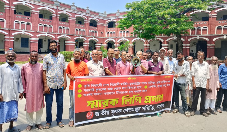 নিজস্ব প্রতিবেদক : আমেরিকার সাথে গোপন বাণিজ্য চুক্তি বাতিলসহ ছয়দফা দাবিতে বিক্ষোভ সমাবেশ ও স্মারকলিপি প্রদান করেছে জাতীয় কৃষক খেতমজুর সমিতি যশোর জেলা শাখা। সোমবার দুপুরে বিক্ষোভ সমাবেশ শেষে যশোরের জেলা প্রশাসকের মাধ্যমে প্রধানমন্ত্রী বরাবর এই স্মারকলিপি প্রদান করা হয়। যশোরের অতিরিক্ত জেলা প্রশাসক সুজন সরকার স্মারকলিপিটি গ্রহণ করেন।