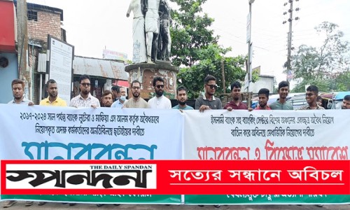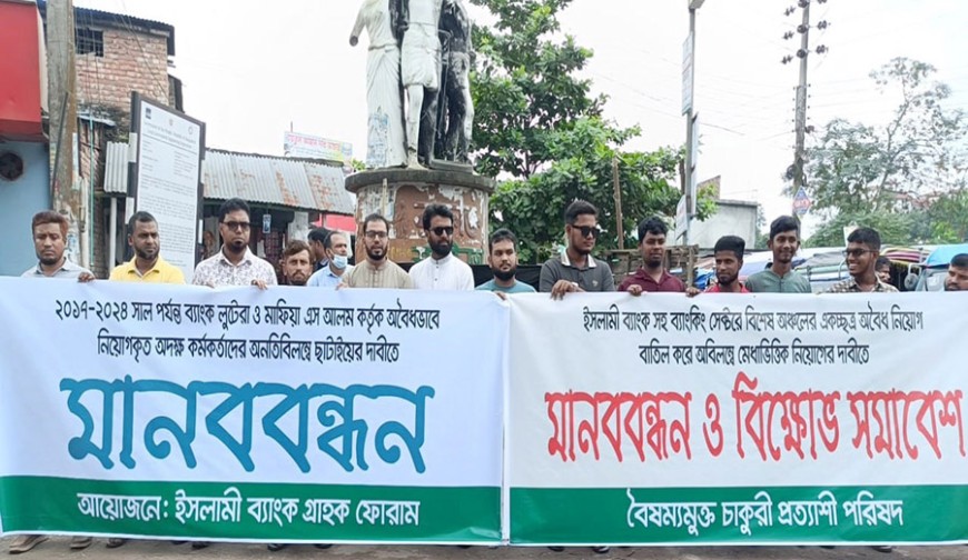 নিজস্ব প্রতিবেদক,মহেশপুর : মহেশপুরে ইসলামী ব্যাংকসহ ব্যাংকিং সেক্টরে অবৈধ নিয়োগ বাতিল এবং মেধাভিত্তিক নিয়োগের দাবিতে মানববন্ধন ও বিক্ষোভ সমাবেশ অনুষ্ঠিত হয়েছে। সোমবার সকালে মহেশপুর কলেজ বাসস্ট্যান্ড এলাকায় এ কর্মসূচি অনুষ্ঠিত হয়। ইসলামী ব্যাংক গ্রাহক ফোরাম এবং বৈষম্যমুক্ত চাকরি প্রত্যাশী পরিষদের ব্যানার ও ফেস্টুন হাতে প্রায় শতাধিক ব্যাংক গ্রাহক, চাকরি প্রত্যাশী ও স্থানীয়রা কর্মসূচিতে অংশ নেন।