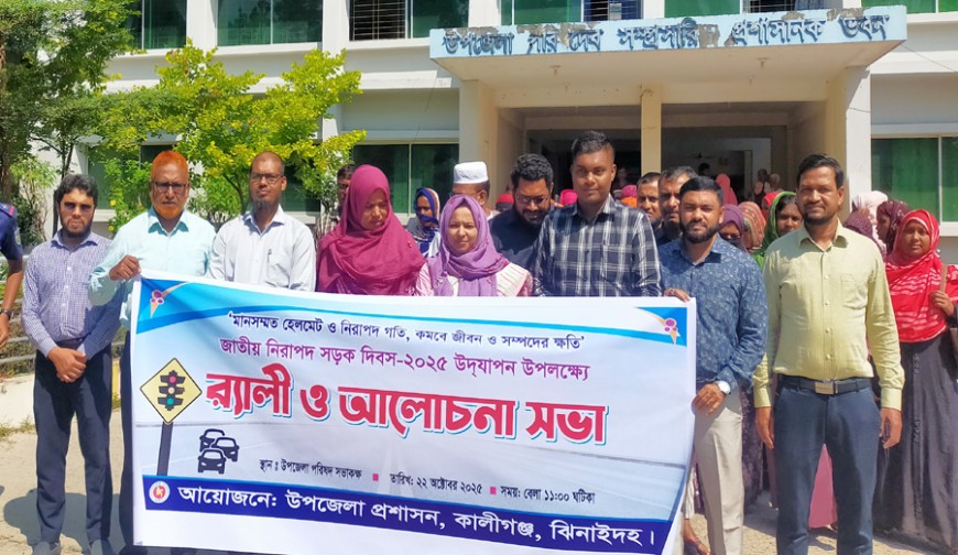 কালিগঞ্জ (ঝিনাইদহ) : সকালে কালিগঞ্জ উপজেলা পরিষদের সামনে র্যালি উদ্বোধন করেন উপজেলা নির্বাহী অফিসার রেজওয়ানা নাহিদ। এরপর উপজেলা পরিষদের সামনে থেকে বর্ণাঢ্য র্যালী বের হয়ে বিভিন্ন মহাসড়ক প্রদক্ষিণ শেষে একই স্থানে এসে শেষ হয়। উপজেলা প্রশাসনের সম্মেলন কক্ষে অনুষ্ঠিত আলোচনা সভায় উপস্থিত ছিলেন, উপজেলা সহকারী কমিশনার শাহিন আলম, কালীগঞ্জ থানার অফিসার ইনচার্জ শফিকুল ইসলাম, বারবাজার হাইওয়ে পুলিশের সার্জন তানভীর হোসেন, বিআরডিবি কর্মকর্তা খাইরুল হক, উপ সহকারী পাট কর্মকর্তা ফারুক হোসেন, কালিগঞ্জ কোটচাঁদপুর মহেশপুর মোটর শ্রমিক ইউনিয়নের সাধারণ সম্পাদক আব্বাস আলী প্রমুখ।