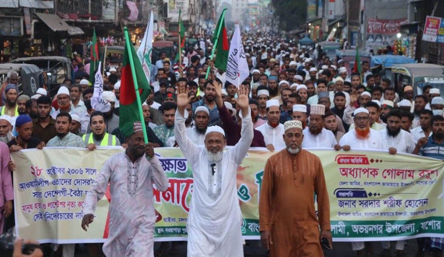 অভয়নগর (যশোর) প্রতিনিধি: অভয়নগরে ২৮ অক্টোবরের খুনিদের বিচার দাবিতে বিক্ষোভ সমাবেশ ও মিছিল অনুষ্ঠিত হয়েছে। মঙ্গলবার বিকেলে উপজেলা জামায়াতে ইসলামীর উদ্যোগে নওয়াপাড়া পুরাতন বাসস্ট্যান্ড এলাকায় এ বিক্ষোভ সমাবেশ অনুষ্ঠিত হয়। সমাবেশ শেষে বাসস্ট্যান্ড এলাকা থেকে বিশাল মিছিল বের করা হয়। মিছিলটি যশোর-খুলনা মহাসড়ক প্রদক্ষিণ করে নওয়াপাড়া রেলওয়ে স্টেশন বাজার এলাকায় গিয়ে শেষ হয়।