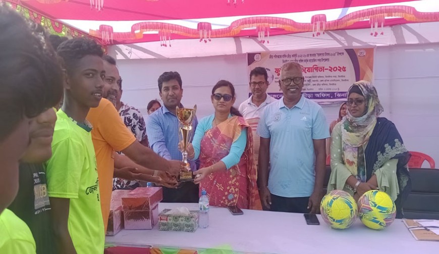 ঝিনাইদহ প্রতিনিধি: ক্রীড়া পরিদপ্তরের বার্ষিক ক্রীড়া কর্মসূচি-২০২৫-২৬ এর আওতায় ‘তারুণ্যের উৎসব-২০২৫’ উপলক্ষে ঝিনাইদহ জেলা ক্রীড়া অফিসের আয়োজনে ফুটবল প্রতিযোগিতা ও পুরস্কার বিতরণী অনুষ্ঠিত হয়েছে। বুধবার সকালে বীরশ্রেষ্ঠ হামিদুর রহমান স্টেডিয়ামে এ প্রতিযোগিতার উদ্বোধন করা হয়। একই দিন বিকালে পুরস্কার বিতরণী অনুষ্ঠিত হয়। জেলা ক্রীড়া অফিসার আমানুল্লাহ আহমেদ’র সভাপতিত্বে প্রধান অতিথি হিসাবে উপস্থিত ছিলেন সদর উপজেলা নির্বাহী কর্মকর্তা হোসনেআরা। সেসময় বিশেষ অতিথি ছিলেন জেলা ফুটবল এসোসিয়েশনের সভাপতি আহসানুজ্জামান ঝন্টুসহ সদর উপজেলার মাধমিক বিদ্যালয়ের শিক্ষকবৃন্দ। এতে অংশগ্রহণ করে সদর উপজেলার ৬টি মাধ্যমিক বিদ্যালয়ের ফুটবলাররা। খেলায় শহরের কালেক্টরেট স্কুল এন্ড কলেজকে ২-০ গোলে হারিয়ে ওয়াজির আলী স্কুল এন্ড কলেজ চ্যাম্পিয়ন হয়। খেলায় সেরা খেলোয়াড় হিসাবে বিবেচিত হন চ্যাম্পিয়ন দলের বাধন। ম্যন অফ দ্যা ফাইনাল বিবেচিত হন রানার্সআপ দলের আব্দুল আলিম। খেলা শেষে উভয় দলের খেলোয়াড়দের মাঝে বিকালে পুরস্কার বিতরণ করা হয়।