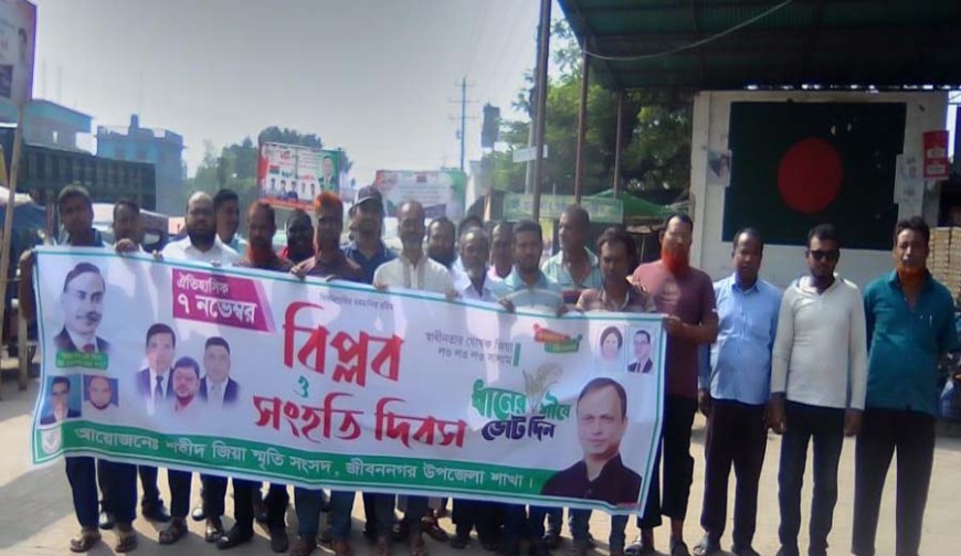 জীবননগর প্রতিনিধি: চুয়াডাঙ্গার জীবননগরে নানা আয়োজনে জাতীয় বিপ্লব ও সংহতি দিবস পালিত হয়েছে। এ উপলক্ষে শহীদ জিয়া স্মৃতি সংসদ জীবননগর উপজেলা শাখার আয়োজনে শুক্রবার সকাল ১০টায় উপজেলা বাসস্ট্যান্ডের মুক্তমঞ্চ থেকে বর্ণাঢ্য র্যালি বের করা হয়। র্যালিতে নেতৃত্ব দেন শহীদ জিয়া স্মৃতি সংসদ জীবননগর উপজেলার আহ্বায়ক . বশির উন নাজির ও সদস্যসচিব প্রভাষক হাসান ইমাম। এসময় উপস্থিত ছিলেন সিনিয়র যুগ্ম আহ্বায়ক. আজিজুর রহমান, যুগ্ম আহ্বায়ক আসাদুল ইসলাম, মাহফুজ আহমেদ মুছা, . সেলিম রেজা, দেলোয়ার হোসেন, শরিফুল ইসলাম, মিনারুল ইসলাম, তানভীর আহমেদ, জুম্মত আলী, খলিলুর রহমান, আদম আলী, সাইফুল ইসলাম ও সালাউদ্দিন লিটন।