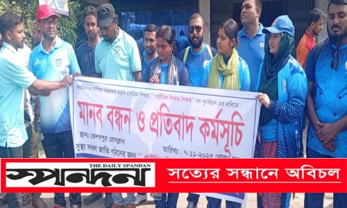 কেশবপুর প্রতিনিধি: কেশবপুরে শারীরিক শিক্ষা কলেজের শিক্ষার্থীরা প্রাথমিক বিদ্যালয়ে শারীরিক শিক্ষক পদ পুনর্বহালের দাবিতে মানববন্ধন ও প্রতিবাদ কর্মসূচি পালন করেছে। শুক্রবার সকালে যশোর-চুকনগর ভায়া কেশবপুর সড়কের প্রেসক্লাবের সামনে ওই মানববন্ধন ও প্রতিবাদ কর্মসূচির আয়োজন করা হয়।