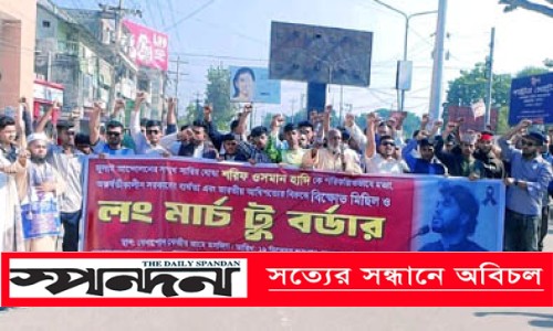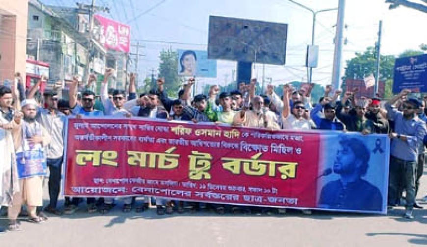 শেখ কাজিম উদ্দিন, বেনাপোল : জুলাই আন্দোলনের সম্মুুখ সারির যোদ্ধা ও ইনকিলাব মঞ্চের মুখপাত্র শরিফ ওসমান হাদি হত্যার প্রতিবাদ এবং ভারতের আধিপত্যবাদী আচরণের বিরুদ্ধে বেনাপোলে বিক্ষোভ মিছিল ও লং মার্চ টু বর্ডার কর্মসূচি পালন করেছে সর্বস্তরের ছাত্র-জনতা। শুক্রবার (১৯ ডিসেম্বর) বেলা সাড়ে ১১টার দিকে বেনাপোল বাজার কেন্দ্রীয় জামে মসজিদ প্রাঙ্গণ থেকে শুরু হওয়া মিছিলটি শহরের প্রধান সড়ক প্রদক্ষিণ করে আন্তর্জাতিক চেকপোস্টে গিয়ে শেষ হয়। মিছিলে বৈষম্যবিরোধী ছাত্র আন্দোলনের নেতাকর্মীসহ বিপুলসংখ্যক ছাত্র-জনতা অংশ নেয়। সমাবেশে বক্তব্য রাখেন বৈষম্যবিরোধী ছাত্র আন্দোলনের শার্শা উপজেলা শাখার উপদেষ্টা আব্দুল মান্নান, আহ্বায়ক আসাদুল্লাহ খালেদ গালিব, সদস্য সচিব সাজেদুর রহমান, মুখ্য সংগঠক নাইমুর রহমান, সদস্য নাইম সিদ্দিকসহ বেনাপোল পোর্ট থানা ছাত্রশিবিরের সাংগঠনিক সম্পাদক জাহিদ হাসান প্রমুখ। সমাবেশে বক্তারা বলেন- বাংলাদেশের ওপর ভারতের দাদাগিরি কোনোভাবেই মেনে নেয়া হবে না। অবিলম্বে হাদি হত্যার সুষ্ঠু তদন্ত, খুনিদের গ্রেপ্তার ও দৃষ্টান্তমূলক শাস্তির দাবি জানান তারা। এ সময় চেকপোস্ট এলাকায় অতিরিক্ত আইনশৃঙ্খলা বাহিনী মোতায়েন করা হয়।