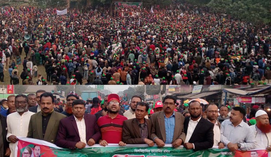 ডুমুরিয়া প্রতিনিধি : ২৫ ডিসেম্বর বিএনপির ভারপ্রাপ্ত চেয়ারম্যান তারেক রহমানের স্বদেশ প্রত্যাবর্তন উপলক্ষে রোববার বিকালে উপজেলা বিএনপির আয়োজনে বিশাল সমাবেশ ও আনন্দ র্যালি অনুষ্ঠিত হয়েছে। বিকাল সাড়ে ৪টার পর থেকে ১৪টি ইউনিয়ন থেকে নেতাকর্মীরা মিছিল সহকারে উপজেলা স্বাধীনতা চত্বরে আসা শুরু করে। বিকাল ৫টার মধ্যে হাজার হাজার নেতাকর্মীর আগমনে স্মৃতিসৌধ চত্বর কানায় কানায় পরিপূর্ণ হয়ে যায়। “মা, মাটি ডাকছে তারেক রহমান আসছে, তারেক জিয়া আসছে, রাজপথ কাঁপছে” এই শ্লোগানে মুখরিত হয়ে ওঠে স্বাধীনতা চত্বর। এরপর স্বাধীনতা চত্বর থেকে খুলনা-সাতক্ষীরা মহাসড়কে আনন্দ র্যালী বের করা হয়। র্যালীটি ডুমুরিয়া কলেজ মোড়ে গিয়ে শেষ হয়। র্যালীতে নেতৃত্বদেন খুলনা-৫ আসনে ধানের শীষের প্রার্থী সাবেক সাংসদ ও বিসিবির সভাপতি মোহাম্মদ আলি আসগার লবি। এ সময় আরো উপস্থিত ছিলেন জেলা বিএনপির সাবেক যুগ্ম-আহবায়ক মোল্যা মোশাররফ হোসেন মফিজ, জেলা যুবদলের আহবায়ক এবাদুল হক রুবায়েদ, উপজেলা বিএনপি নেতা শেখ সরোয়ার হোসেন, জেলা কৃষক দলের সভাপতি মোল্যা কবির হোসেন, জেলা শ্রমিক দলের সাধারণ সম্পাদক খান ইসমাইল হোসেন, উপজেলা বিএনপি নেতা সরদার আব্দুল মালেক, গাজী আব্দুল হালিম, শেখ হাফিজুর রহমান, মোল্যা মাহাবুর রহমান, হাবিবুর রহমান হবি, শেখ শাহিনুর রহমান, শেখ মতিয়ার রহমান বাচ্চু, শেখ ফরহাদ হোসেন, অরুন গোলদার, মশিউর রহমান লিটন, খান আবজাল হোসেন, আমিনুর রহমান, ডাঃ আলম, মুনিমুর রহমান নয়ন, মোল্যা মশিউর রহমান, শেখ হেলাল উদ্দিন, প্রভাষক মুঞ্জুর রশিদ, ফয়সাল আহমেদ, মনিরুজ্জামান সোহাগ, হুমায়ুন কবির স্বপন, আঃ রব আকুঞ্জি, মাস্টার আমিরুল ইসলাম, আবুল হোসেন সরদার, আঃ সালাম মহালদার, শাহদাৎ হোসেন, আহম্মদ আলী, শাহিনুর রহমান, শফিকুল ইসলাম, ইকরামুল হোসেন, আতিয়ার রহমান, আঃ ছালাম, শহীদ মোড়ল, শেখ আব্দুল মান্নান প্রমুখ।