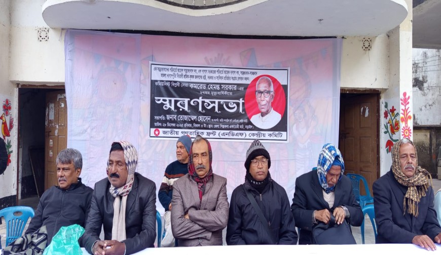 প্রেসবিজ্ঞপ্তি : প্রয়াত কমিউনিস্ট বিপ্লবী কমরেড হেমন্ত সরকার-এর ২৭তম মৃত্যুবার্ষিকীতে রোববার নড়াইল জেলা শিল্পকলা একাডেমি মাঠে এক স্মরণসভা অনুষ্ঠিত হয়। স্মরণ সভায় সভাপতিত্ব করেন জাতীয় গণতান্ত্রিক ফ্রন্টের কেন্দ্রীয় সহ-সভাপতি তোজাম্মেল হোসেন। স্মরণ সভায় বক্তব্য রাখেন কেন্দ্রীয় সহ-সাধারণ সম্পাদক প্রকাশ দত্ত, কেন্দ্রীয় কোষাধ্যক্ষ বিএম শামীমুল হক, যুগ্ম-সম্পাদক তাপস বিশ্বাস, এনডিএফের কেন্দ্রীয় সদস্য ও খুলনা জেলা সভাপতি আবুল হোসেন, যশোর জেলা সভাপতি আশুতোষ বিশ্বাস, নড়াইল জেলা সভাপতি আক্তার হোসেন, কৃষক সংগ্রাম সমিতির নড়াইল জেলা সাধারণ সম্পাদক হুমায়ন কবির, জাতীয় ছাত্রদল কেন্দ্রীয় সাধারণ সম্পাদক মধুমঙ্গল বিশ্বাস। পরিচালনা করেন কেন্দ্রীয় সাংগঠনিক সম্পাদক কামরুল হক লিকু।