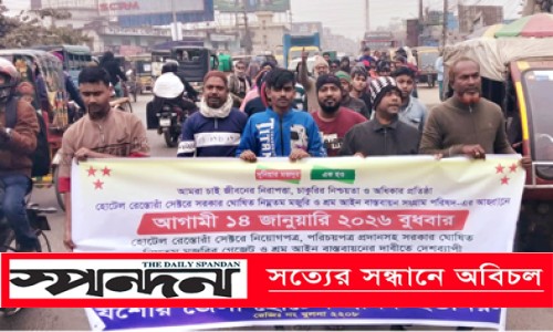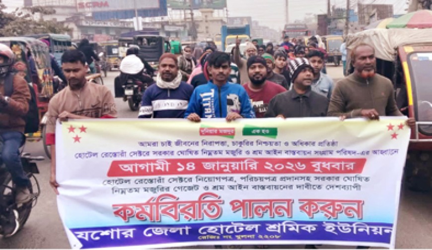 প্রেসবিজ্ঞপ্তি : মঙ্গলবার দুপুর ১২টায় হোটেল রেস্তোরাঁ সেক্টরে সরকার ঘোষিত নিম্নতম মজুরি ও শ্রম আইন বাস্তবায়ন সংগ্রাম পরিষদ-এর আহ্বানে দেশব্যাপী কর্মসূচির অংশ হিসেবে যশোর মণিহার বাসস্ট্যান্ড চত্বরে শ্রমিক বিক্ষোভ সমাবেশ অনুষ্ঠিত হয়। আগামী ১৪ জানুয়ারি বুধবার দেশব্যাপী কর্মসূচির অংশ হিসেবে যশোর জেলায় হোটেল শ্রমিকদের কর্মবিরতি পালনের আহ্বান জানিয়ে সমাবেশে সভাপতিত্ব করেন সংগ্রাম পরিষদের জেলা আহ্বায়ক কামাল পারভেজ বুলু। বক্তব্য রাখেন বাংলাদেশ ট্রেড ইউনিয়ন সংঘের জেলা সহ-সাধারণ সম্পাদক কামরুজ্জামান রাজেস, হোটেল রেস্তোরাঁ সেক্টরে সরকার ঘোষিত নিম্নতম মজুরি ও শ্রম আইন বাস্তবায়ন সংগ্রাম পরিষদ-এর জেলা যুগ্ম-আহ্বায়ক আইয়ুব হোসেন ও সদস্য মোঃ রাজু আহমেদ প্রমুখ।