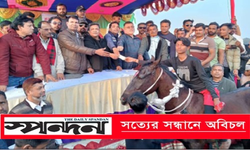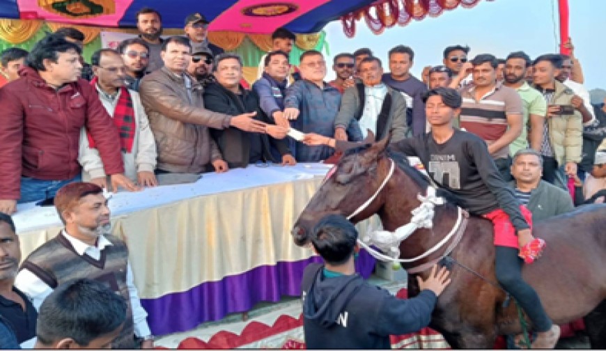 নিজস্ব প্রতিবেদক : শীতের বিকাল। মিষ্টি রোদ্দুর। বোরো ধান আবাদের জন্য মাঠ প্রস্তুত করে রেখেছেন কৃষক। সেই মাঠে হয়ে গেলো গ্রামীণ ঐতিহ্যবাহী ঘোড় দৌড় প্রতিযোগিতা। প্রতিযোগিতা দেখতে ঢল নেমেছিল নানা বয়সী মানুষের। মেলা প্রাঙ্গণের আশপাশের বিস্তীর্ণ এলাকাজুড়ে গ্রামীণ মেলা বসে। এই মেলায় শিশুদের খেলনা, পিয়াজু-পাঁপড় ভাজি, হরেক রকম পণ্যের পসরা সাজিয়ে বসে দোকানিরা। একইসঙ্গে শিশুদের বিনোদনের জন্য জাম্পিং ডবল, ঘুরলি ঘোড়া, বক্সিং ওয়েট, ছোট নাগরদোলা ও বড় নাগরদোলা নিয়ে আসেন উদ্যোক্তারা। শনিবার যশোর সদরের ইছালী ইউনিয়নের হুদা রাজাপুর গ্রামে এই ঐতিহ্যবাহী ঘোড় দৌড় প্রতিযোগিতার আয়োজন করে রাজাপুর যুবসমাজ। অনুষ্ঠানে সভাপতিত্ব করেন ইছালী ইউনিয়ন বিএনপির সভাপতি অধ্যাপক মাহমুদ আলম। প্রধান অতিথি ছিলেন জেলা বিএনপির সাংগঠনিক সম্পাদক ইঞ্জিনিয়ার রবিউল ইসলাম। বিশেষ অতিথি ছিলেন সদর উপজেলা বিএনপি'র সহ সাধারণ সম্পাদক কামরুজ্জামান কামরুল, ধর্ম বিষয়ক সম্পাদক রেজাউল ইসলাম, কোতোয়ালী থানা বিএনপি'র সদস্য কাজী আজগর হোসেন, জেলা কৃষক দলের ভারপ্রাপ্ত সভাপতি আবু জাফর, ইছালী ইউনিয়ন মহিলা বিএনপির আহবায়ক জেসমিন নাহার বর্ষা। অনুষ্ঠান সঞ্চালনা করেন ইছালী ইউনিয়ন ছাত্রদল সাধারণ সম্পাদক তানভীর হাসান রিয়াল। প্রতিযোগিতায় ৫ দল অংশ নেয়। এতে যশোর সদর উপজেলার রাজাপুর গ্রাম প্রথম স্থান অর্জন করে। প্রথম পুরস্কার হিসেবে ৭ হাজার, দ্বিতীয় পুরস্কার ৫ হাজার ও তৃতীয় পুরস্কার ৩ হাজার নগদ টাকা প্রদান করা হয়।