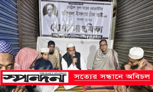 নিজস্ব প্রতিবেদক : যশোর শহরের গাড়ীখানা রোডস্থ ফুল ব্যবসায়ীদের উদ্যোগে ষষ্ঠিতলা পাড়া বি.পি. রোডের বাসিন্দা ও গাড়ীখানা সেন্ট্রাল ফুলঘরের স্বত্বাধিকারী মরহুম রফিকুল ইসলাম চাঁনের বিদেহি আত্মার মাগফেরাত কামনায় দোয়া মাহফিল অনুষ্ঠিত হয়েছে। শুক্রবার বাদ আসর গাড়ীখানা এলাকায় এ দোয়া অনুষ্ঠানের আয়োজন করা হয়। এতে মরহুমের রুহের মাগফেরাত কামনা করে বিশেষ দোয়া করা হয় এবং শোকসন্তপ্ত পরিবার-পরিজনের প্রতি গভীর সমবেদনা জানানো হয়। দোয়া মাহফিলে উপস্থিত ছিলেন জাতীয় গণতান্ত্রিক পার্টি—জাগপা’র প্রেসিডিয়াম সদস্য,খুলনা বিভাগীয় প্রধান সমন্বয়ক ও যশোর জেলা প্রতিষ্ঠাতা সভাপতি নিজামদ্দিন অমিত। এছাড়াও স্থানীয় ফুল ব্যবসায়ী,দোকানদার ও বিভিন্ন শ্রেণি-পেশার নেতৃবৃন্দ অনুষ্ঠানে অংশ নেন। দোয়া শেষে মহান আল্লাহর কাছে মরহুমকে জান্নাতুল ফেরদৌস নসিব করার পাশাপাশি তাঁর পরিবার-পরিজনকে ধৈর্য ধারণের তাওফিক দানের জন্য প্রার্থনা করা হয়।