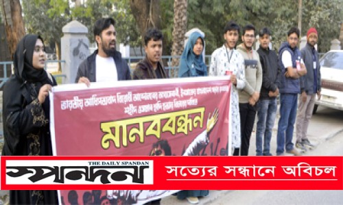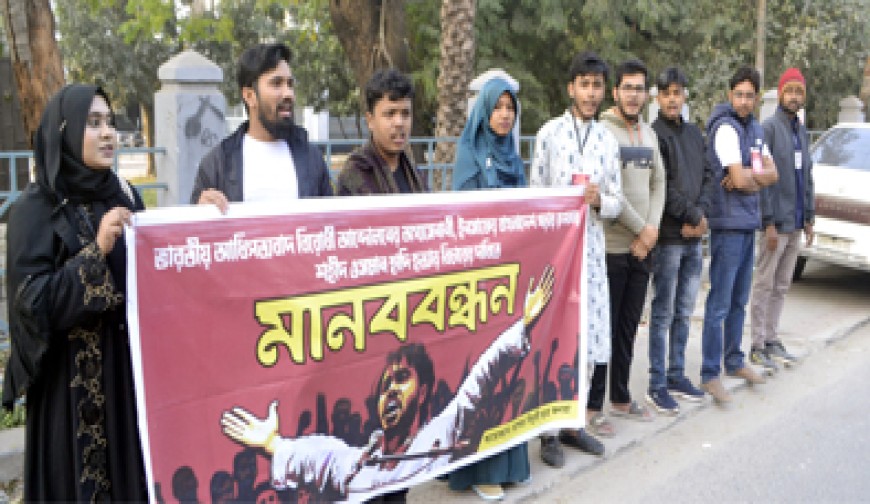 নিজস্ব প্রতিবেদক: যশোর বিপ্লবী ছাত্র-জনতার উদ্যোগে রোববার বিকেলে প্রেসক্লাব যশোরের সামনে মানববন্ধন কর্মসূচি পালিত হয়েছে। মানববন্ধনে জুলাই বিপ্লবের অন্যতম সংগঠক ও ইনকিলাব মঞ্চের মুখপাত্র শরীফ ওসমান হাদীর পরিকল্পিত হত্যাকাণ্ডের সুষ্ঠু বিচার দাবি করা হয়। মানববন্ধনে আয়োজকরা বলেন-শরীফ ওসমান হাদীকে পরিকল্পিতভাবে হত্যা করা হয়েছে, যা জাতির জন্য গভীর উদ্বেগ ও লজ্জার বিষয়। দীর্ঘ সময় পার হলেও এখনো এ হত্যাকাণ্ডের বিচার নিশ্চিত না হওয়ায় জনগণের মধ্যে চরম ক্ষোভ বিরাজ করছে। অবিলম্বে দোষীদের গ্রেপ্তার করে দৃষ্টান্তমূলক শাস্তি নিশ্চিত করতে সরকারের প্রতি জোর দাবি জানান তারা। বক্তারা আরও বলেন, ভারতীয় আগ্রাসন ও সীমান্তে বারবার উসকানিমূলক তৎপরতা দেশের সার্বভৌমত্বের জন্য হুমকি স্বরূপ। প্রতিবেশী দেশের অন্যায় হস্তক্ষেপ ও আধিপত্যবাদী নীতির বিরুদ্ধে সরকারকে শক্ত অবস্থান নিতে হবে বলে তারা দাবি করেন। মানববন্ধন থেকে হুঁশিয়ারি দিয়ে বলা হয়, দাবি বাস্তবায়নে সরকার কার্যকর পদক্ষেপ না নিলে ছাত্র-জনতাকে সঙ্গে নিয়ে আরও কঠোর আন্দোলনের কর্মসূচি ঘোষণা করা হবে।