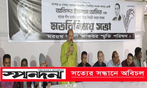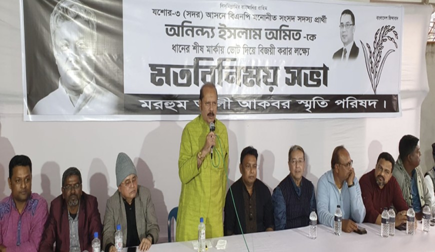 নিজস্ব প্রতিবেদক : যশোর-৩ সদর আসনে ধানের শীষের প্রার্থী বিএনপি নেতা অনিন্দ্য ইসলাম অমিতের পক্ষে এক মতবিনিময় সভা শহরের খালধার রোড এলাকায় অনুষ্ঠিত হয়। মরহুম আলী আকবর স্মৃতি পরিষদের উদ্যোগে মতবিনিময় সভায় প্রধান অতিথি ছিলেন প্রেস ক্লাব যশোরের সভাপতি জাহিদ হাসান টুকুন। স্মৃতি পরিষদের সভাপতি ও যশোর ইন্সটিটিউট নাট্যকলা সংসদের সাধারণ সম্পাদক আব্দুর রহমান কিনার সভাপতিত্বে মতবিনিময় সভায় বিশেষ অতিথি হিসেবে বক্তৃতা করেন যশোর ইন্সটিটিউটের সাধারণ সম্পাদক ডা. আবুল কালাম আজাদ লিটু, যশোর জেলা বিএনপির সাংগঠনিক সম্পাদক প্রকৌশলী রবিউল ইসলাম ও জেলা স্বেচ্ছাসেবক দলের আহবায়ক মোস্তফা আমির ফয়সাল। সভায় অন্যান্যের মধ্যে বক্তৃতা করেন সাংবাদিক ইউনিয়ন যশোরের সাবেক সভাপতি নূর ইসলাম, যশোর পৌরসভার ২ নম্বর ওয়ার্ডের সাবেক কমিশনার শেখ রাশেদ আব্বাস রাজ ও সাংস্কৃতিক ব্যক্তিত্ব বিশিষ্ঠ ব্যবসায়ী রাকিবুদ্দৌল্লাহ শুভ্র । সভায় বিশিষ্ট ব্যবসায়ী মুরাদ হোসেন, যশোর জেলা যুব অধিকার পরিষদের সাধারণ সম্পাদক ও সাংস্কৃতি ব্যক্তিত্ব মিলন সেখ আপনসহ স্থানীয় ২ নং ওয়ার্ডের সর্বস্তরের নেতৃবৃন্দসহ কয়েকশ’ নারী পুরুষ উপস্থিত ছিলেন।