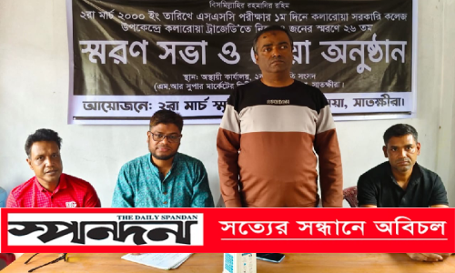 কলারোয়া প্রতিনিধি : কলারোয়া কলেজ ট্র্যাজেডির ২৬তম বর্ষপূর্তি উপলক্ষে নিহতের স্মরণে স্মরণসভা ও দোয়ানুষ্ঠান অনুষ্ঠিত হয়েছে। সোমবার কলারোয়া এমআর সুপার মার্কেটে দোসরা মার্চ স্মৃতি সংসদ আয়োজিত এ স্মরণ সভায় উদযাপন কমিটির আহবায়ক আশরাফুজ্জামান বাবুর সভাপতিত্বে বক্তব্য রাখেন ও উপস্থিত ছিলেন দোসরা মার্চ স্মৃতি সংসদের প্রতিষ্ঠাতা সভাপতি তাওফিকুর রহমান সঞ্জু, প্রতিষ্ঠাতা সাধারণ সম্পাদক প্রভাষক আরিফ মাহমুদ, প্রতিষ্ঠাতা সদস্য বদরুজ্জামান বিলাস, মোহাম্মদ কবিরুল ইসলাম, জাকির হোসেন কলারোয়া সরকারি কলেজ ছাত্র নেতা কাইফুর রহমান সৈকত, মোস্তফা তাহসিন অংকুর, শেখ রাব্বি হাসান, রাহুল হোসেন, সাইফুল ইসলাম মুকুল প্রমুখ। স্মরণসভা পরিচালনা করেন উদযাপন কমিটির সদস্য সচিব শরিফুজ্জামান বাবলু। দোয়া অনুষ্ঠান পরিচালনা করেন সাংবাদিক সাজেদুল করিম তপু। এর আগে সকাল ৭টায় প্রতিষ্ঠানের অস্থায়ী কার্যালয় কালো পতাকা উত্তোলন করা হয়, সকাল ৯টায় কালোব্যাজ ধারণ কর্মসূচি পালন করা হয়। উল্লেখ্য, ২০০২ সালের ২ মার্চ এসএসসি পরীক্ষার প্রথমদিনে কলারোয়া সরকারি কলেজ উপকেন্দ্রে অনাকাঙ্ক্ষিত এক ঘটনায় হুড়োহুড়ির এক পর্যায়ে পদপিষ্ট হয়ে মারা যান পরীক্ষার্থী লিপিসহ ৪ জন।