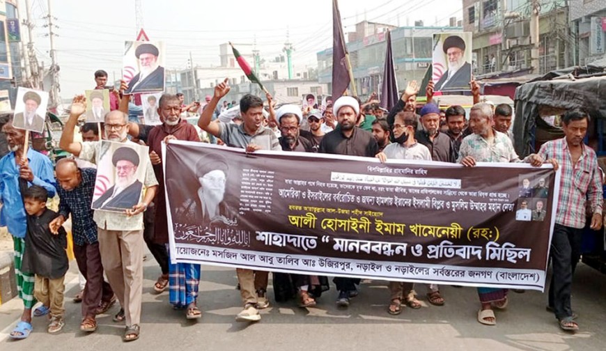 নিজস্ব প্রতিবেদক, নড়াইল : ইরানের সর্বোচ্চ ধর্মীয় নেতা আয়াতুল্লাহ আলি খামেনিকে হত্যার ঘটনায় নড়াইলে মানববন্ধন ও প্রতিবাদ মিছিল অনুষ্ঠিত হয়েছে। মঙ্গলবার (৩ মার্চ) বেলা ১১টার দিকে নড়াইল প্রেসক্লাব চত্বরে মসজিদ আল আবু তালিব (আ.) এর মুসলিম সমাজের উদ্যোগে মানববন্ধন ও প্রতিবাদ মিছিল অনুষ্ঠিত হয়। এ কর্মসূচিতে শত শত নারী-পুরুষ অংশগ্রহণ করেন।