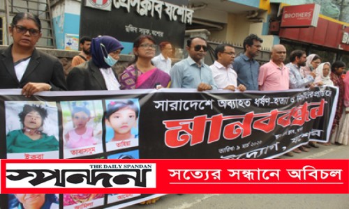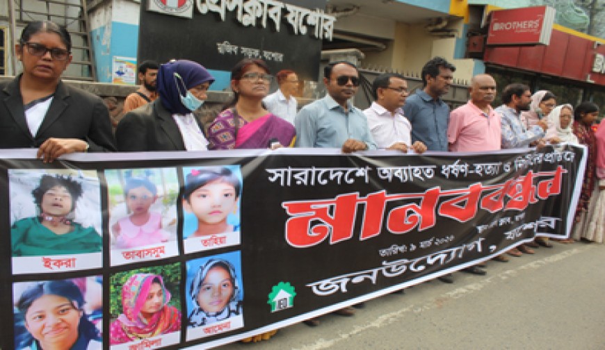 নিজস্ব প্রতিবেদক: ধর্ষণ-হত্যা ও নিপীড়নের প্রতিবাদে জনউদ্যোগ যশোরের মানববন্ধন অনুষ্ঠিত হয়েছে। সোমবার সকাল ১০টায় যশোর প্রেস ক্লাব চত্বরে আয়োজিত এই মানববন্ধন থেকে সারাদেশে অব্যাহত ধর্ষণ-হত্যা ও নিপীড়নের প্রতিবাদ জানান নেতৃবৃন্দ। মানববন্ধনে বক্তারা বলেন- ধর্ষণ, হত্যা ও নারীর প্রতি সকল ধরনের সহিংসতা প্রতিরোধে কঠোর আইন প্রয়োগ করতে হবে এবং রাস্তাঘাটে, কর্মক্ষেত্র নিরাপদ পরিবেশ তৈরি করতে হবে। বক্তারা আরও বলেন- আইন সংশোধন করে ধর্ষণের শাস্তি মৃত্যুদণ্ড করা হলেও ধর্ষণ-নির্যাতন কমছে না। কারণ বিচারের বাণী এখনও নিভৃতে কাঁদছে। তাই আইনের শাসন নিশ্চিত এবং দোষীদের দৃষ্টান্তমূলক শাস্তি কার্যকর করতে হবে। পাশাপাশি ধর্ষক, নিপীড়কদের সামাজিকভাবে বয়কট করতে হবে। অপরাধীদের বিরুদ্ধে সামাজিক প্রতিরোধ গড়ে তুলতে পারলে সমাজ থেকে অপরাধ কমিয়ে আনা সম্ভব। এজন্য বক্তারা অপরাধীদের বিরুদ্ধে সামাজিক প্রতিরোধ গড়ে তোলার আহ্বান জানান। জনউদ্যোগ যশোরে আহবায়ক প্রকৌশলী নাজির আহমদের সভাপতিত্বে এ মানববন্ধন অনুষ্ঠিত হয়। মানববন্ধনে বক্তব্য রাখেন শ্রমিক নেতা মাহবুবুর রহমান মজনু, রাজনৈতিক ব্যক্তিত্ব হাসিনুর রহমান, যশোর জজ কোর্টের সাবেক পিপি অ্যাড. আবুল হোসেন, সুরধুনীর সভাপতি হারুর-অর রশীদ, অবসরপ্রাপ্ত শিক্ষক শাহীন ইকবাল, যশোর সাংবাদিক ইউনিয়নের সাধারণ সম্পাদক হাবিবুর রহমান মিলন, মহিলা পরিষদের যশোর জেলা কমিটির ভারপ্রাপ্ত সাধারণ সম্পাদক সুলতানা রহমান জলি, জনউদ্যোগের যুগ্ম আহবায়ক অধ্যাপক সুরাইয়া শরীফ, নারী ফোরামের আহবায়ক নারীনেত্রী অ্যাড. সৈয়দা মাসুমা বেগম, মহিলা পরিষদের আইন বিষয়ক বিষয়ক সম্পাদক ও জনউদ্যোগ সদস্য নারী নেত্রী অ্যাড. কামরুন নাহার কনা, প্রাইডের নির্বাহী পরিচালক উজ্জ্বল কুমার বালা, আইইডি যশোর কেন্দ্রের ব্যবস্থাপক বীথিকা সরকার, ছাত্রনেতা ও চিত্রশিল্পী রাশেদ খান, শিক্ষার্থী রুবিনা খাতুন প্রমুখ। মানববন্ধন পরিচালনা করেন জনউদ্যোগের সদস্য সচিব কিশোর কুমার কাজল।