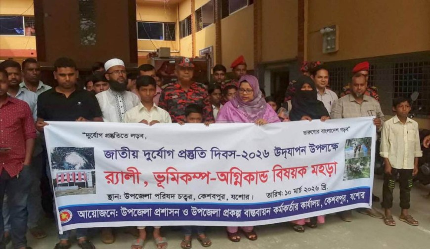 কেশবপুর প্রতিনিধি : কেশবপুরে জাতীয় দুর্যোগ প্রস্তুতি দিবস-২০২৬ উপলক্ষে র্যালি ও ভূমিকম্প-অগ্নিকাণ্ড বিষয়ক মহড়া অনুষ্ঠিত হয়েছে।