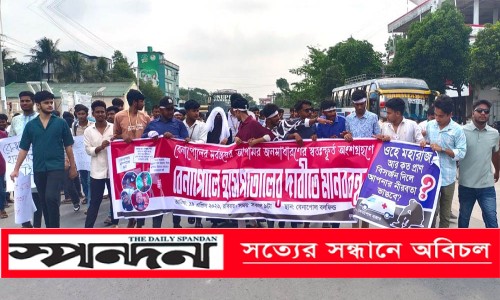 শেখ কাজিম উদ্দিন, বেনাপোল : দেশের সর্ববৃহত্তম স্থলবন্দর বেনাপোলে একটি পূর্ণাঙ্গ সরকারি হাসপাতাল প্রতিষ্ঠার দাবিতে ছাত্র জনতার মানববন্ধন ও বিক্ষোভ কর্মসূচীতে উত্তাল হয়ে ওঠে সীমান্তবর্তী এই জনপদ। রোববার (১৯ এপ্রিল) সকাল ৯টার দিকে বেনাপোল বলফিল্ড এলাকায় ‘বেনাপোলবাসী’ ব্যানারে এ কর্মসূচী শুরু হয়। এতে ছাত্র-যুবসমাজ, ব্যবসায়ী, শ্রমজীবী মানুষ, গণমাধ্যমকর্মীসহ সর্বস্তরের জনগণের স্বতঃস্ফূর্ত অংশগ্রহণ দেখা যায়।